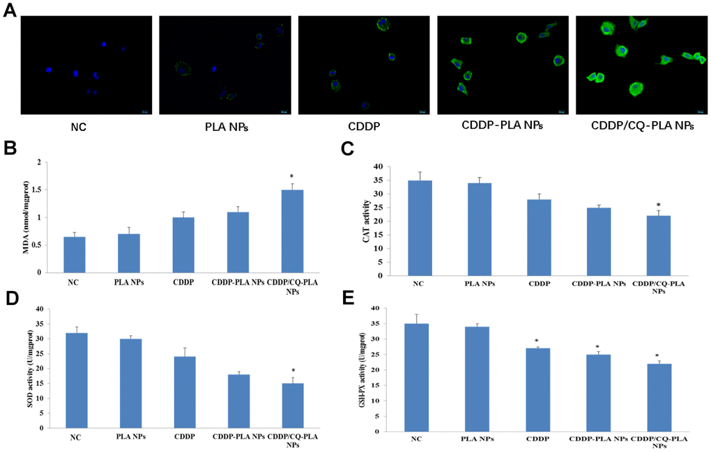 Furthermore, we found that CDDP/CQ-PLA NPs induced more ROS production (Figure 4A and Supplementary Figure 3) and MDA (Figure 4B), followed by decreased CAT (Figure 4C), SOD (Figure 4D), and GSH-P activity (Figure 4E), which suggested that CDDP/CQ-PLA NPs induces caspase-dependent apoptosis through oxidative damage in OSCC cells.