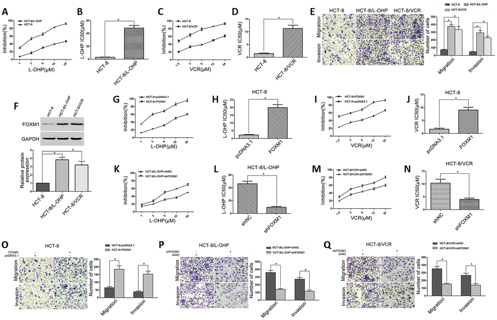 Next, we determined the possibility of targeting FOXM1 to suppress both metastasis and drug- resistance. The data acquired showed that cell sensitivities to oxaliplatin (IC50 2.25μM vs 19.92μM) and vincristine (IC50 1.61μM vs 9.04μM) were significantly reduced in HCT-8 cells transfected with FOXM1 recombinant vector (Figure 1G–1J), while the cell sensitivities to oxaliplatin (IC50 46.26μM vs 9.63μM) and vincristine (IC50 10.33μM vs 3.96μM) were respectively promoted in HCT-8/L-OHP and HCT-8/VCR cells transfected with shFOXM1 (Figure 1K–1N). Besides, the cell migratory and invasive potential were enhanced in HCT-8 cells transfected with FOXM1 recombinant vector (Figure 1O), while impaired in HCT-8/L-OHP and HCT-8/VCR cells transfected with shFOXM1 (Figure 1P–1Q). These data suggested that FOXM1 was positively associated with metastasis and drug sensitivity, silencing FOXM1 simultaneously inhibited metastasis and chemoresistance of CRC.