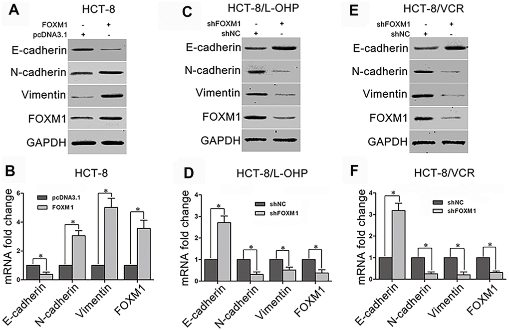To explorer underlying mechanism by which FOXM1 simultaneously induced metastasis and chemoresistance of CRC, we examined the effect of FOXM1 on EMT which facilitates both cell motility and drug-resistance. The recombinant vector of FOXM1 was transfected into HCT-8 cells. The results showed that the protein and mRNA levels of epithelial marker E-cadherin were decreased by the ectopic expression of FOXM1 compared with the control group, while the mesenchymal markers N-cadherin and Vimentin were up-regulated (Figure 2A–2B). To validate that the expressions of E-cadherin, N-cadherin and Vimentin were controlled by FOXM1, shFOXM1 was transfected into HCT-8/L-OHP and HCT-8/VCR cells. As predicted, E-cadherin was up-regulated by the knockdown of FOXM1, while N-cadherin and Vimentin were down-regulated (Figure 2C–2F). These results suggested that FOXM1 induced EMT-like molecular changes in CRC cells.