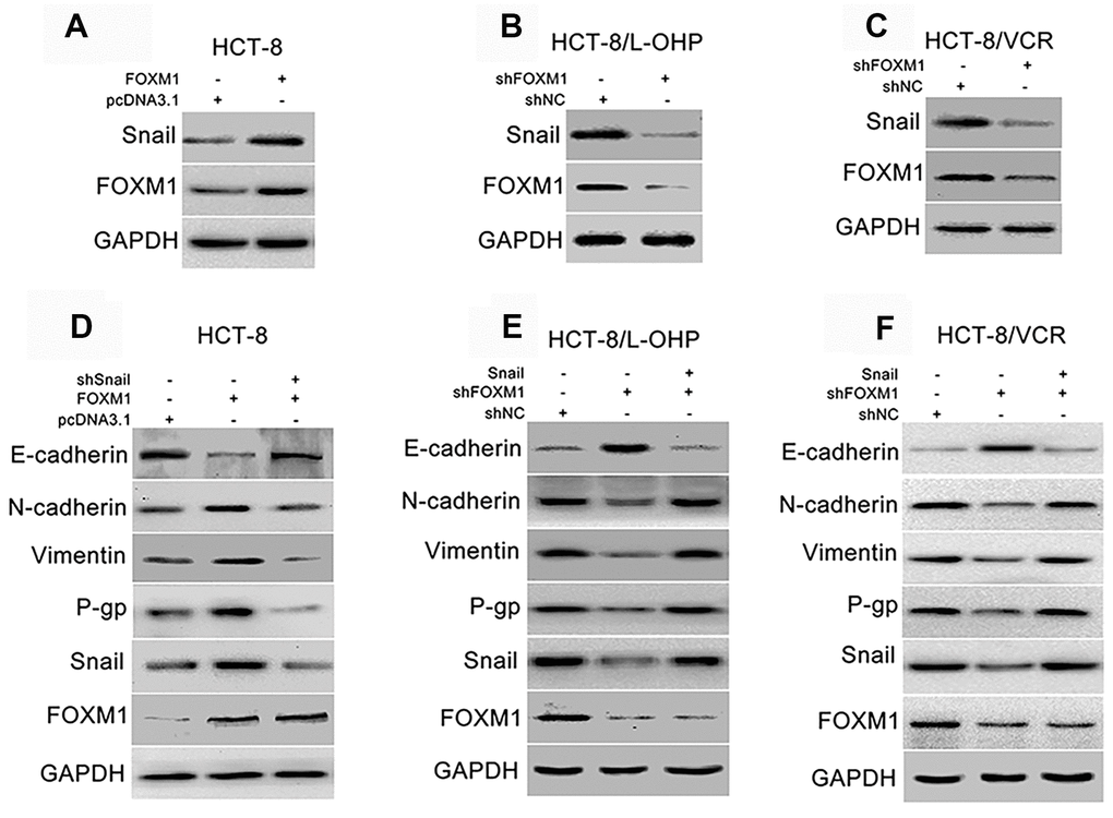 Snail is regarded as the core transcription factor of EMT [45, 46]. So, we evaluated the effect of FOXM1 on Snail, and the role of Snail in FOXM1-mediated expression of EMT-associated markers. The protein level of Snail was increased by overexpression of FOXM1 in HCT-8 cells transfected with recombinant vectors of FOXM1 (Figure 3A), while reduced by knockdown of FOXM1 in HCT-8/L-OHP and HCT-8/VCR cells transfected with shFOXM1 (Figure 3B–3C). Next, the recombinant vector of FOXM1 was co-transfected with shSnail into HCT-8 cells. Our results showed that FOXM1-induced down-regulation of E-cadherin, up-regulation of N-cadherin and Vimentin were eliminated by silencing Snail (Figure 3D). Moreover, the recombinant vector of Snail was co-transfected with shFOXM1 into HCT-8/L-OHP and HCT-8/VCR cells. We found that shFOXM1-induced up-regulation of E-cadherin, down-regulation of N-cadherin and Vimentin were reversed by Snail overexpression (Figure 3E, 3F). Considering that EMT also plays a crucial role in chemoresistance of cancers [12, 13], we further examined the effect of Snail on FOXM1-mediated expression of multidrug-resistance protein P-gp. The results showed that the protein level of P-gp was positively regulated by FOXM1, while FOXM1-induced P-gp expression was abolished by silencing Snail (Figure 3D). In addition, shFOXM1-decreased P-gp expression was rescued by Snail overexpression (Figure 3E, 3F). These data suggested that FOXM1 up-regulated Snail to induce EMT- like molecular changes and P-gp expression.