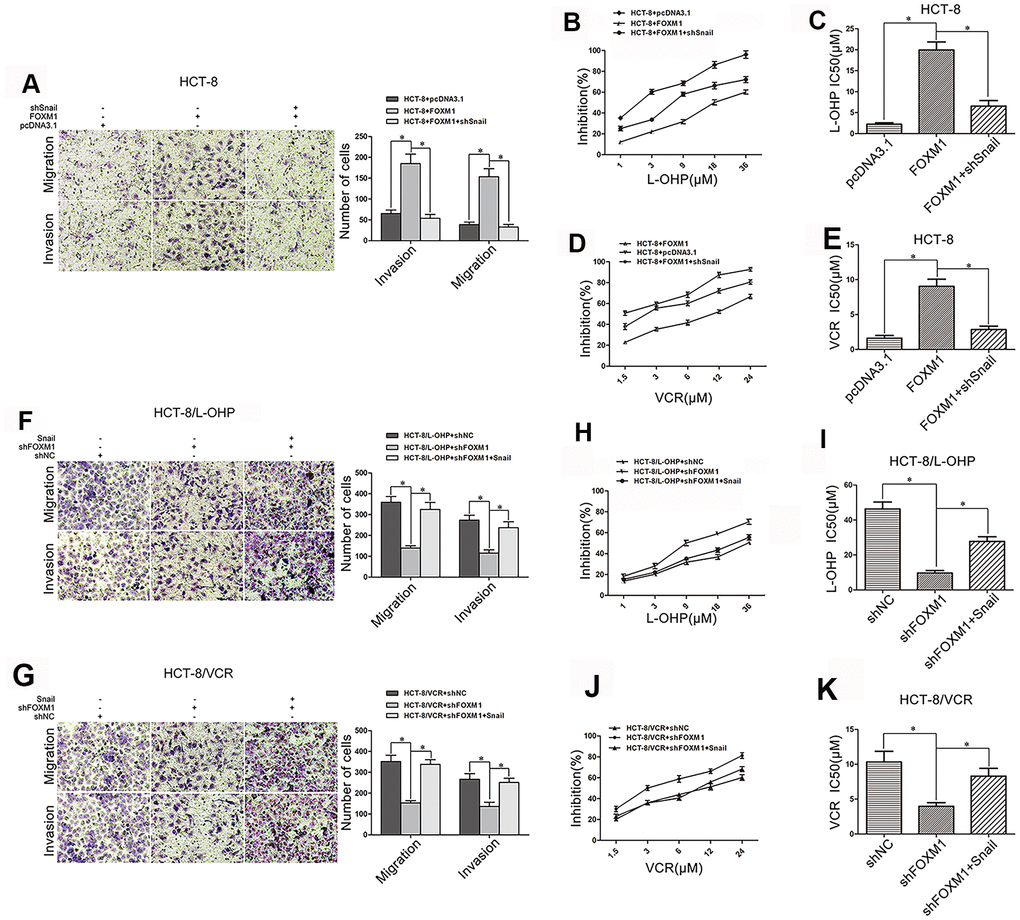 Snail is considered to be the core transcription factor that drives EMT of epithelial tumor cells, which is almost involved in the whole process of tumor EMT [45, 46, 60, 61]. Thus, we evaluated the effect of FOXM1 on Snail expression, and the role of Snail in FOXM1-regulated expression of EMT-associated markers. Our results showed that FOXM1 positively regulated Snail expression in HCT-8, HCT-8/L-OHP, and HCT-8/VCR cells (Figure 3A–3C), while silencing Snail eliminated FOXM1-induced EMT-like molecular changes (Figure 3D). Besides, Snail overexpression reversed shFOXM1-mediated EMT-associated markers changes (Figure 3E, 3F). These data indicated that FOXM1 increased Snail expression to trigger EMT-like molecular changes. A substantial body of evidence has confirmed that during EMT, Snail can inhibit epithelial markers and up-regulate mesenchymal markers to reduce cell-cell adhesion and promote cell motility. Elevated Snail expression indicates a high risk of distant metastases of cancer cells [62]. Moreover, Snail also factors into drug-resistance in ovarian, breast, prostate, and head and neck cancers [63–66], although the underlying mechanism is not entirely clear. Interestingly, our data showed that FOXM1 triggered multidrug-resistance protein P-gp expression via Snail in CRC cells (Figure 3D–3F). Collectively, these results suggested that FOXM1 could simultaneously drive metastasis and chemoresistance in CRC cells via Snail. As expected, silencing Snail suppressed FOXM1-induced migration, invasion, and drug-resistance to oxaliplatin and vincristine in HCT-8 cells (Figure 4A–4E), while overexpression of Snail rescued shFOXM1-dereased migration, invasion, and drug-resistance in HCT-8/L-OHP and HCT-8/VCR cells (Figure 3F–3K).