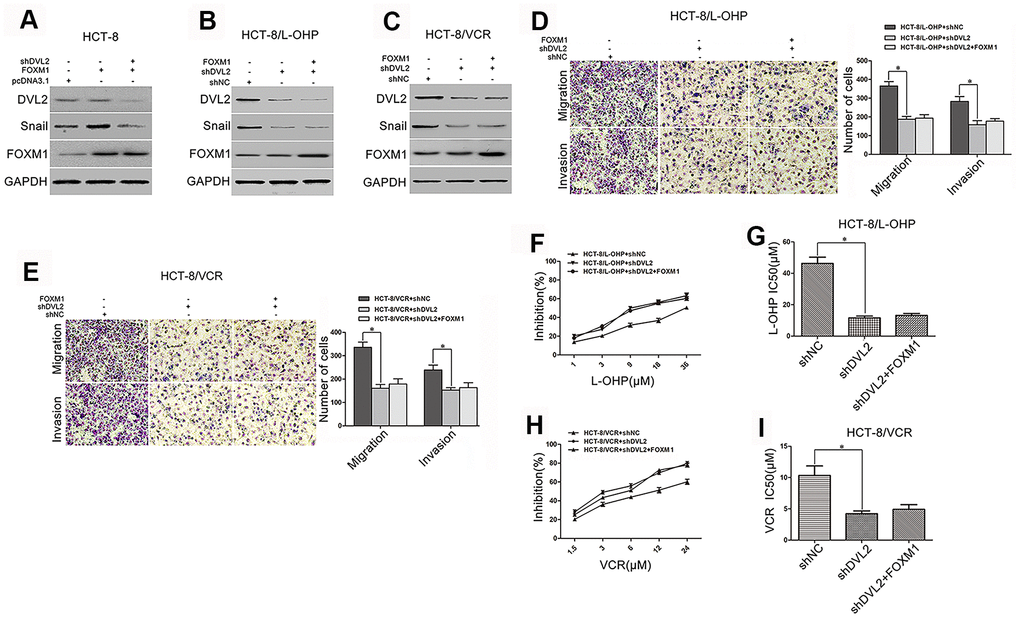 Although we have identified that FOXM1 induced the expression of Snail, this was not the case in DVL2 knockdown HCT-8 cells (Figure 5A). It was sure that Snail expression was decreased by silencing DVL2 in HCT-8/L-OHP and HCT-8/VCR cells. When DVL2 was silenced by shDVL2, the decreased Snail protein level was not rescued by FOXM1 (Figure 5B–5C). Meanwhile, the effect of FOXM1 on expression of DVL2 was observed. Unexpectedly, the expression of DVL2 was not significantly changed by ectopic expression of FOXM1 in HCT-8, HCT-8/L-OHP and HCT-8/VCR cells, and the down-regulation of DVL2 by shDVL2 was not rescued by FOXM1 (Figure 5A–5C). These results suggested that FOXM1 induced Snail expression via DVL2, independently of DVL2 expression. Furthermore, the migration and invasion, and drug-resistance to oxaliplatin (IC50 46.26 μM vs 11.56 μM) and vincristine (IC50 10.33 μM vs 4.21 μM) were inhibited by silencing DVL2 in HCT-8/L-OHP and HCT-8/VCR cells (Figure 5D–5I). Meanwhile, FOXM1 lost the ability to induce migration, invasion and drug-resistance when DVL2 was silenced (Figure 5D–5I). Collectively, above data indicated that DVL2 was required for FOXM1-mediated Snail expression, metastasis and chemoresistance, while FOXM1 did not change expression of DVL2.