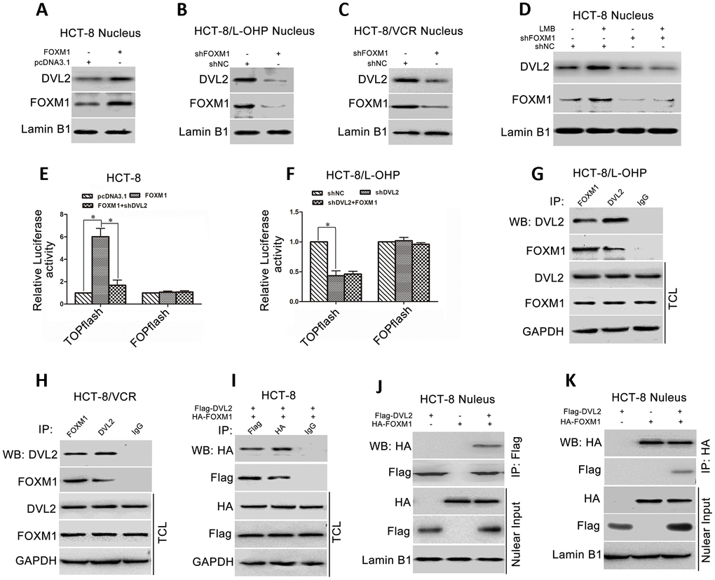 We further explored how FOXM1 regulated the nuclear accumulation of DVL2. The physical association between FOXM1 and DVL2 was checked. The results of co-immunoprecipitation (Co-IP) revealed that endogenous FOXM1 and DVL2 were precipitated down by each other in HCT-8/L-OHP and HCT-8/VCR cells (Figure 6G, 6H). Furthermore, the recombinant vector of HA-FOXM1 and Flag-DVL2 were transfected into HCT-8 cells. The fusion protein HA-FOXM1 was physically associated with Flag-DVL2 in the nucleus (Figure 6I–6K). Collectively, above data suggested that FOXM1 bound to DVL2 and facilitated nuclear translocation of DVL2 and DVL2-mediated transcriptional activity of Wnt/β-catenin.