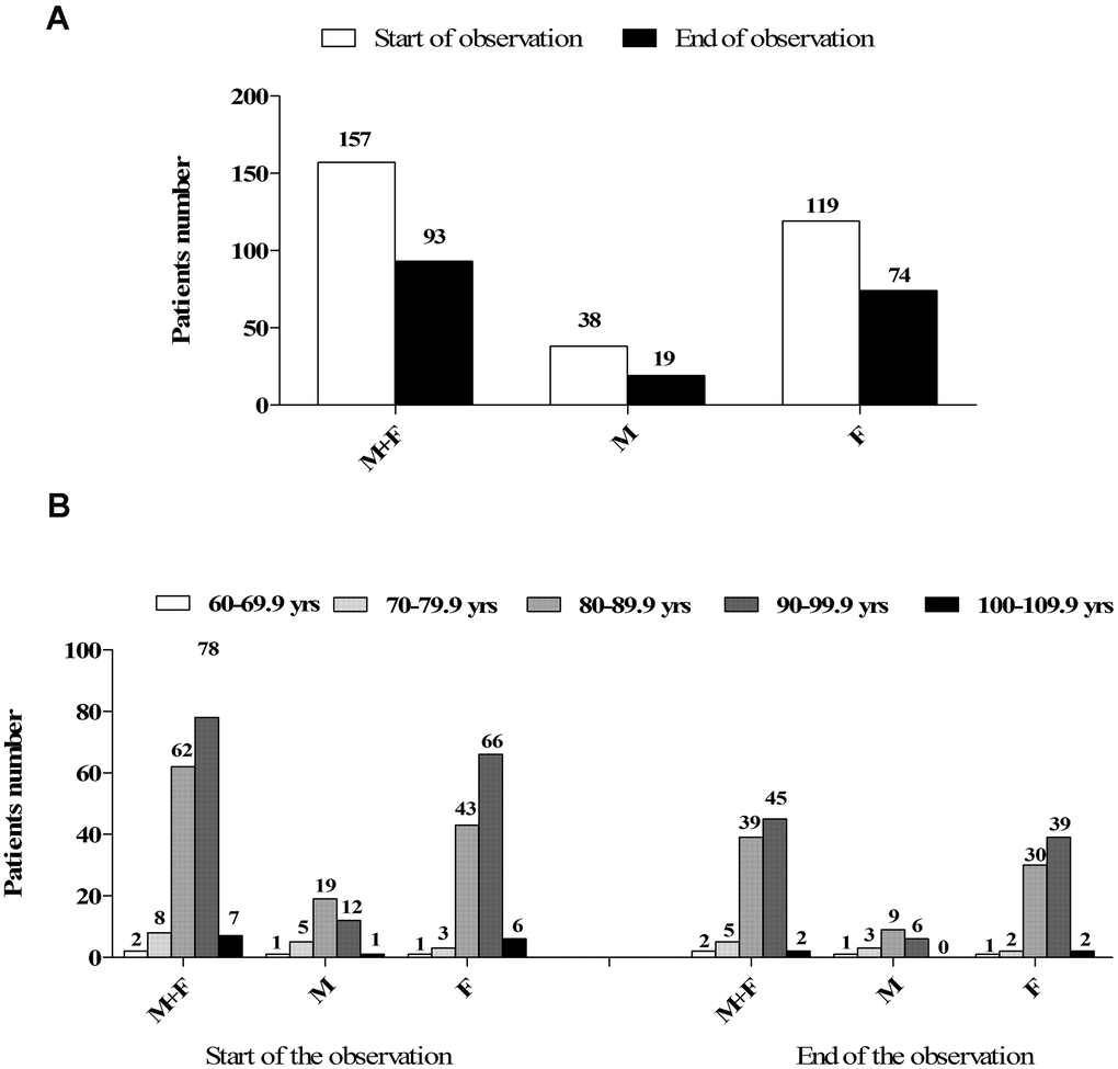 A total of 157 subjects were hosted in the IRCCS Istituto Auxologico Italiano “Mons. G. Bicchierari” nursing home on March 1st, 2020, most of whom aged between 80 and 100 years old (Table 1 and Figure 1A). At the end of the two-months observational study, 93 subjects were still alive (Figure 1B). Characteristics of the cohort here studied are reported in Tables 1–3, Supplementary Table 1. 63% of subjects tested positive for SARS-CoV-2 on the nasopharyngeal swab test. 37% remained negative despite serial testing and were therefore isolated on a different floor of the building. In particular, 6 out of 11 subjects that showed symptoms and tested negative on their first viral RNA swab test, resulted positive on repeating the test, whilst the rest continued to test negative. Also, serological evaluation found 8 positive patients among the patients who were negative to the swab, still alive at the end of the observation and who performed the serological evaluation (n. 34), whereas it found 4 negative results among the 40 patients positive to nasopharyngeal swab who were alive at the end of the observation and accepted to perform the test for anti-COVID-19 immunoglobulins.