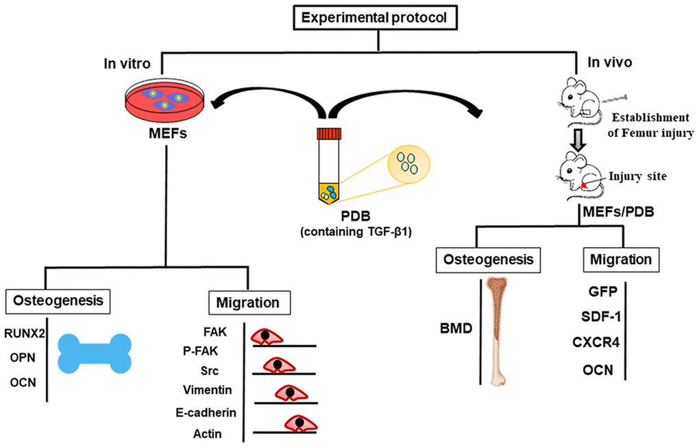Furthermore, PDB is safe and biocompatible due to biological origin, hence the chances of immune response or infection could be avoided. Therefore, in this study, we investigated the impact of PDB-contained TGF-β1 on proliferative, migratory and osteo-inductive characteristics of mouse embryonic fibroblasts (MEFs) in bone injury mice model, as described in experimental protocol (Figure 1).