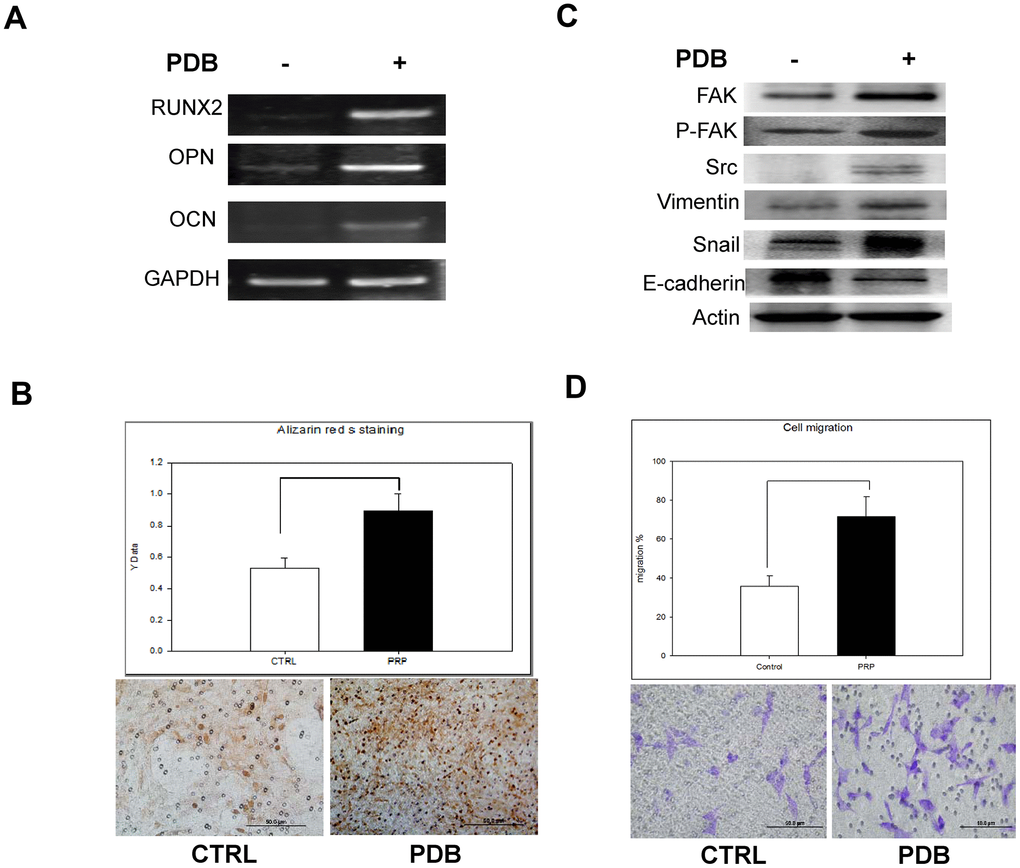 To investigate the in vitro effect of PDB on osteogenesis, MEFs were cultured in media with or without PDB for 21 days. We found that PDB-treated group revealed a marked increase in gene expression of osteogenic markers RUNX 2, OPN and OCN (Figure 2A). Subsequently, we used Alizarin Red S staining on the MEFs to determine degree of mineralization, which was also enhanced in PDB-treated group (Figure 2B, lower panel). The quantified results also demonstrated a 2-fold higher staining intensity when compared to the CTRL group (Figure 2B, higher panel).