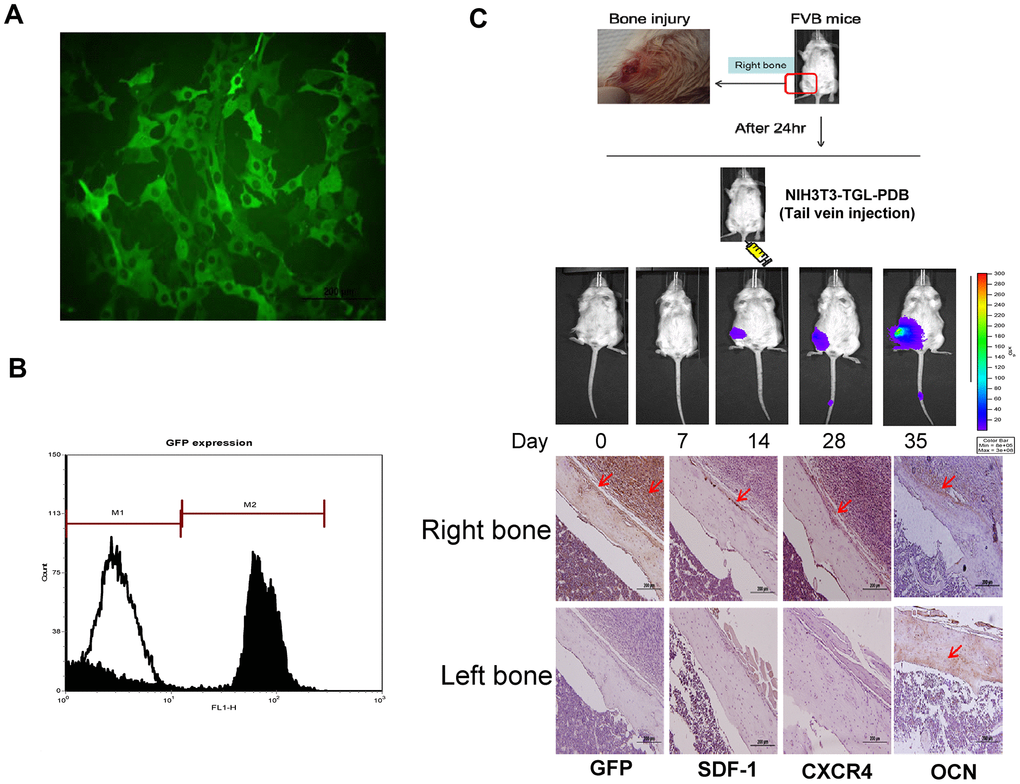 Based on increased expressions of migration and EMT markers, we then investigated the PDB effect on cell migration invivo by molecular imaging through establishing bone injury at right femurs. For optical imaging, we also established MEF-TGL cell line through lentiviral transduction of thymidine kinase (T), green fluorescence protein (G) and luciferase genes (L) into MEFs. The expression of GFP in MEF-TGL cells was validated by fluorescent microscopic (Figure 3A) and flow cytometry (Figure 3B).