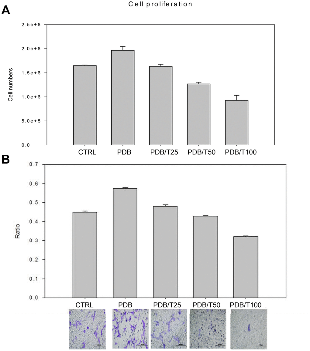 Based on the above-mentioned evidences for strong efficacy of PDB on MEFs migratory potential, we further confirmed its role by using Ti, which specifically binds to TGF-β. The TGF-β has been recognized as a key component among the plethora of PDB [12] promoting cellular migration [16]. We first optimized Ti inhibitory concentration, which showed the degenerative characteristics in terms of cellular proliferation in a dose-dependent fashion (Figure 4A), when compared to control; whereas, the PDB showed a stimulatory effect. This result was also consistent in transwell cell migration assay and its quantification revealing decreased number of migrated cells in Ti-treated cells (Figure 4B). These above results imply that Ti suppressed cellular migration through inhibiting TGF-β1; whereas, the PDB could stimulate the cellular growth.