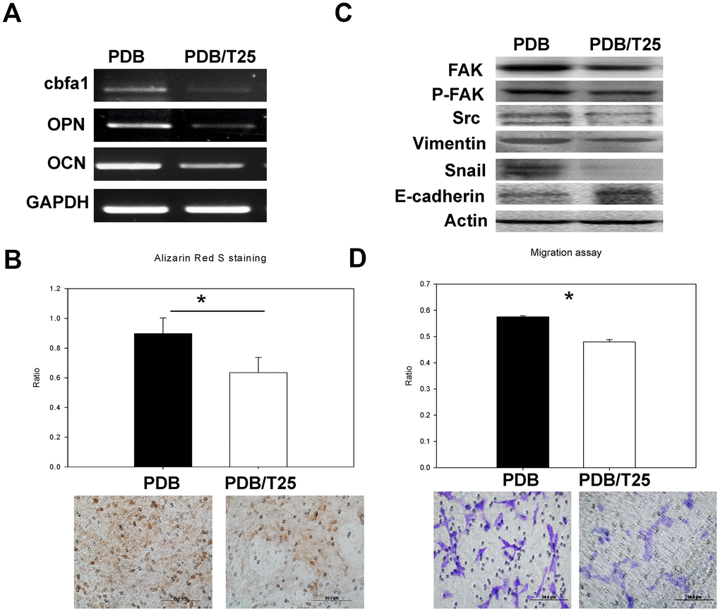To further confirm TGF-β1-induced migration of MEFs, we employed inhibitor of TGF-β receptor I (Ti) specifically binding to TGF-β1 receptor and determined its inhibitory concentration, the dose of 25nM of which inhibited cellular proliferation and migration. Thus, it could be inferred that during coupled processes of recruiting MEFs to bone remodeling surfaces and osteogenesis, the TGF-β1 functions as a primary factor, and its dysregulation leads to pathological state. Further, the RUNX2 is a multifunctional transcription factor and an essential master gene controlling osteoblast differentiation and enhances their migration by coupling with PI3K-Akt signaling [26, 27]. While examining PDB-induced migratory potential of MEFs in the presence of Ti, the levels of RUNX2 found inhibited, implying TGF-β1 stimulatory activity towards MEFs migration. During osteogenesis, OPN and OCN are well-known intermediate and late stage markers of osteoblasts [28]. In comparison to PDB, the Ti also suppressed gene expression of OPN and OCN, suggesting TGF-β1 promoted osteogenesis. This was further supported by alizarin Red S staining for determining calcium deposits stained as dark red regions [29] which appeared feeble in Ti-treated group when compared to PDB.