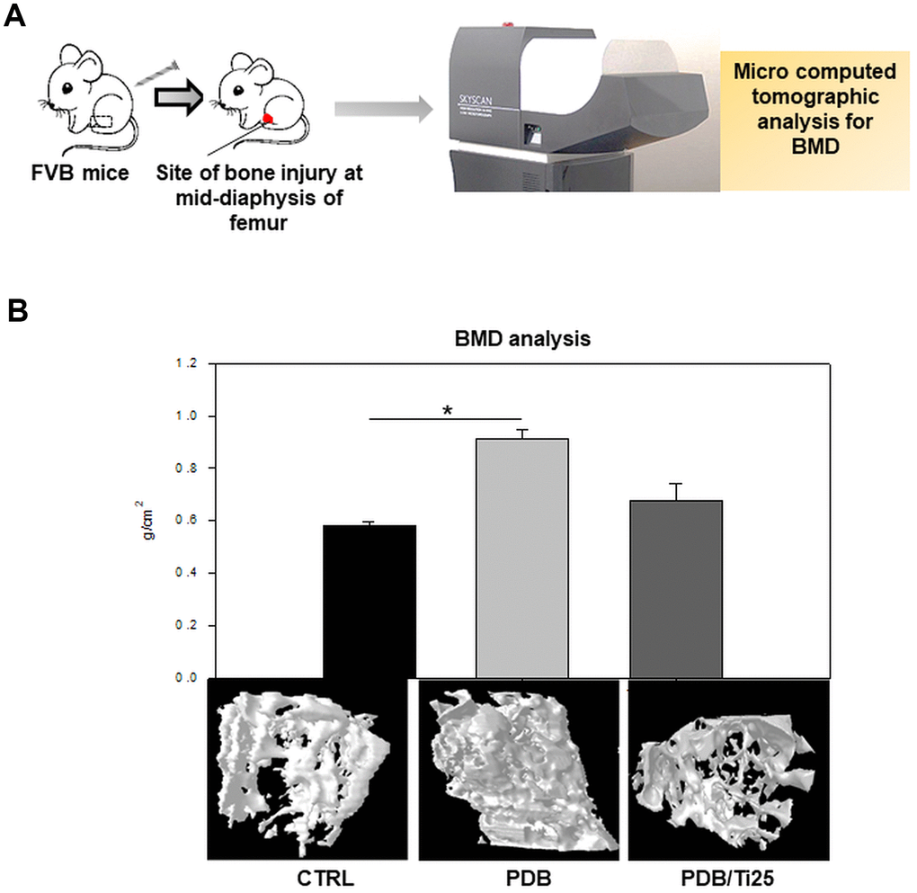 At day 0, a transcortical hole was drilled using a dental bur at mid-diaphysis of bilateral femurs, producing a bone defect of 1.5 mm in diameter. The mice each from the control, PDB and PDB+T25 group were sacrificed at day 35 after injury. Bilateral femoral samples were obtained by cutting along the long axis of the femur including the mid region of drilled site at the anterior cortex. The BMD of femurs was assessed by dual-energy x-ray absorptiometry. This test was initially performed at time 0 (at 0.5 mo) and once at 35 days for different treatment regimes (the endpoint of the experiment was set at 3 mo after the ovariectomy). The BMD of femurs was measured and collected using a densitometer (XR-36; Norland Corp.; host software revision 2.5.3, scanner software revision 2.0.0).