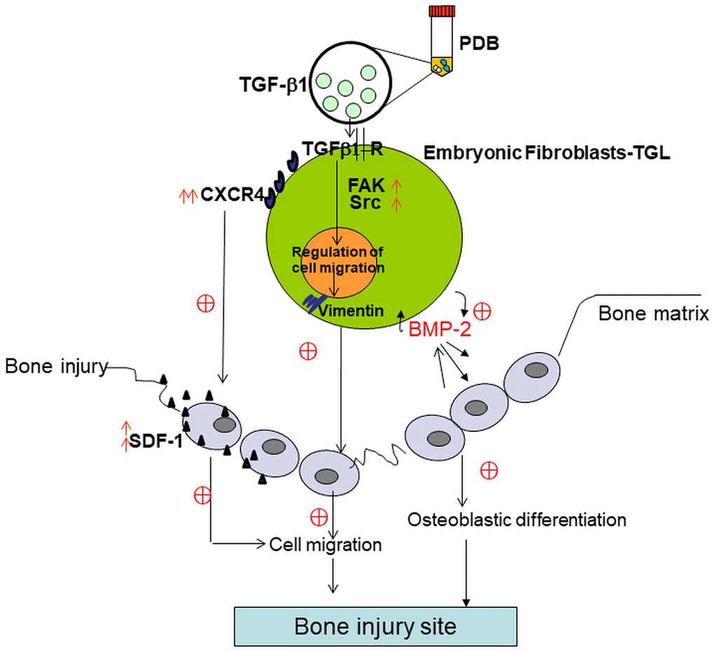 Taken together, our results indicate the role of PDB contained TGF-β1 in enhancing embryonic fibroblasts migratory ability to improve bone injury and also deduced the possible underlying therapeutic mechanism. During repair and regeneration of bone injury, the administered PDB-treated MEFs reversed the pathologic characteristics primarily by enhancing migratory factors and BMD leading to osteogenesis (Figure 7).