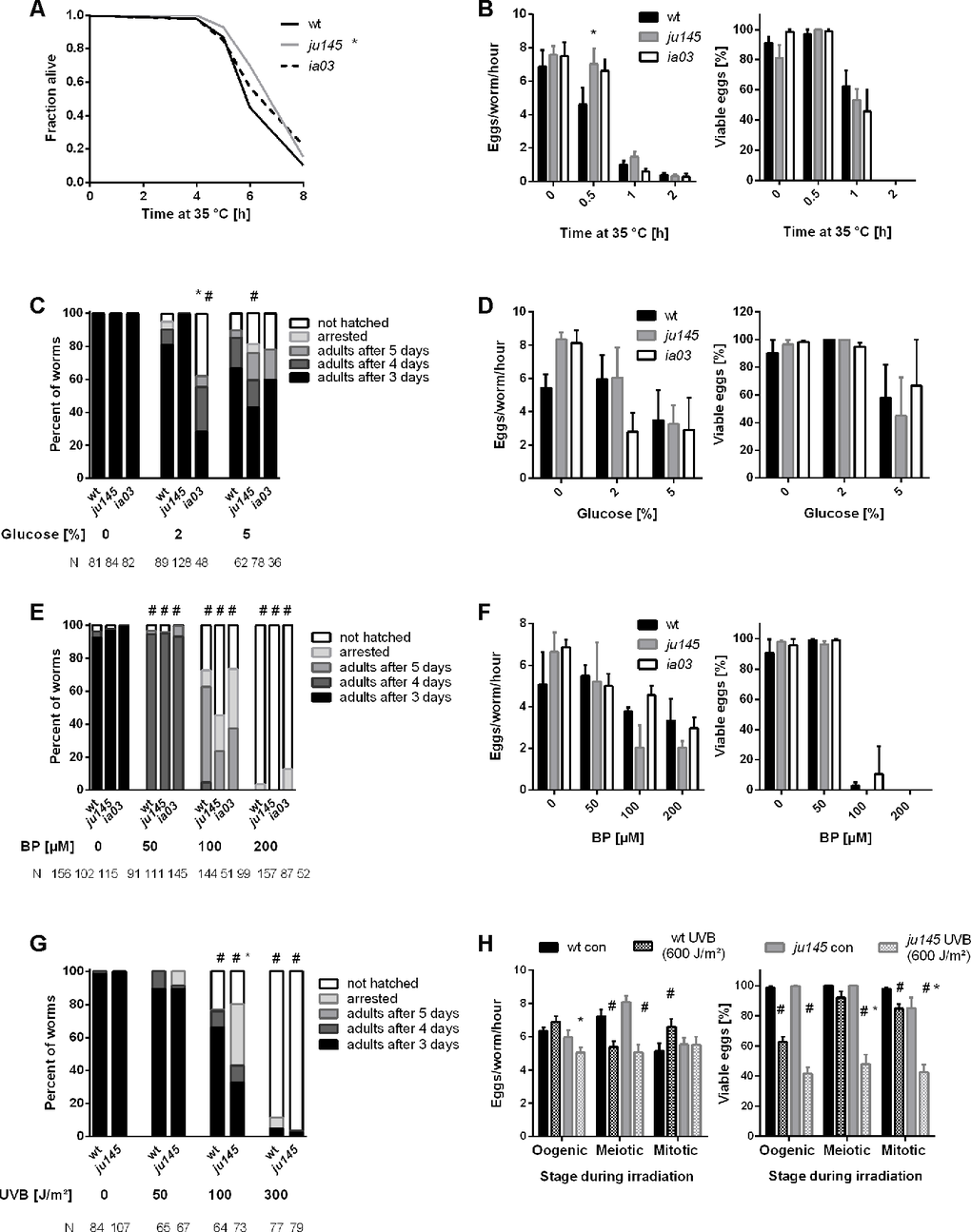 3 days old worms were treated with UVB and the effect of irradiation on germ-cells in different stages (oogenic stage, meiotic stage, and mitotic stage) was investigated, as described in [78]. Briefly, the number and viability of eggs laid between 1 – 8 hours (oogenic stage), 8 – 24 hours (meiotic stage), and 24 – 32 hours (mitotic stage) after the irradiation were analyzed.