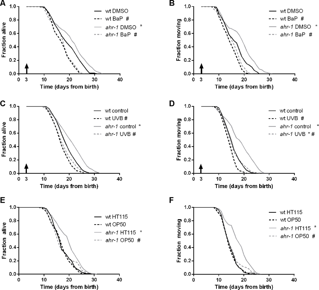 Contradictory roles for AhR in the aging process have been identified (reviewed in [7]), but more recently, consistent pro-aging functions in health and lifespan were described across species [8, 9]. In this study, using C. elegans as a unique model organism to disclose novel potential functions of the AhR, we revealed a more complex role for this transcription factor in stress response and aging in basal conditions and in response to known vertebrate modulators of its activity. The differential effects on lifespan and gene expression we observed upon ahr-1 genetic- or RNAi-mediated suppression (or upon different temperature), interestingly reveal the importance of fine-tuning AhR activity in a dose and/or tissue-dependent manner, which very nicely recapitulate the variety of phenotypic features described in mammals upon AhR dosages or tissue-specific depletion [7]. Although we assume ahr-1 RNAi partially reduces AHR-1 expression and the ahr-1(ju145) is a loss-of-function allele, we did not in fact measure AHR-1 activity and therefore we cannot exclude that residual AHR-1 is more active or retain alternative functions.