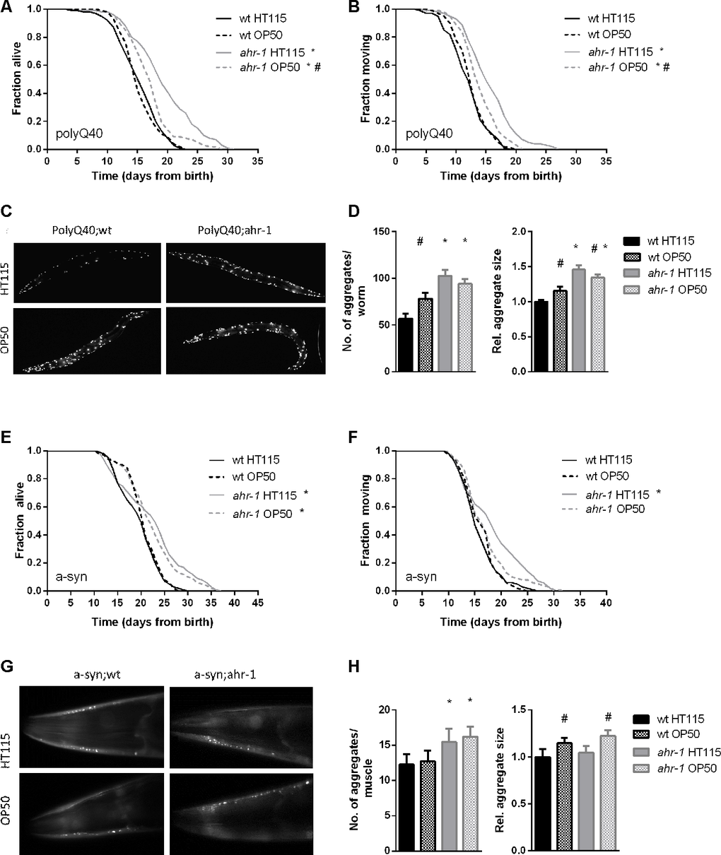 Most notably, we identified for the first time a critical role for AHR-1-bacterial diet interaction in regulating aging and associated phenotypes. As part of our initial attempt to identify environmental/dietary factors modulating aging in an AhR-dependent manner, we focused on the two most commonly strains used for C. elegans feeding, E. coli HT115 and E. coli OP50, which are known to differentially impact C. elegans aging-associated disease [38, 42]. We found that ahr-1 mutants displayed an extended health- and lifespan on HT115 but not on the OP50 bacterial diet. It will be interesting to investigate the effects of other bacteria strains serving as food source and microbiota for C. elegans [57–59], as well as the effects of other dietary components (e.g. resveratrol, chalcones) known to extend C. elegans lifespan [60, 61] on AhR-control of the aging process. Loss of ahr-1 also ameliorated health- and life-span in models of age-associated pathologies with aggregation-prone proteins expressed in the muscles in a diet-dependent manner. Yet, surprisingly, the beneficial effect did not correlate with the amount and size of the aggregates, indicating either that aggregation in this context has a beneficial effect, or that loss of ahr-1 promotes health-span independently from mechanisms regulating proteotoxic aggregation. The effect of AHR-1 on aggregation-prone diseases may suggest novel targeted therapeutic options of relevance for different age-associated diseases. Interestingly, prototype AhR activators, such as TCDD and BaP, were shown to contribute to the development and progression of age-associated diseases (reviewed in [62, 63]) in different model systems [64] and a recent study showed increased AhR levels in serum brains of Alzheimer’s disease patients [65]. On the other hand, reduced α-synuclein levels were observed in the mouse ventral midbrain upon TCDD-induced AhR-dependent Parkin expression [66]. This contradictory effect of AhR on age-associated diseases is consistent with the impact of AhR on aging (reviewed in [7]) and likely represent the tip of the iceberg of a largely explored AhR function. Of note, our study indicates C. elegans represents a powerful model system to get insights into the role AhR in age-associated disorders.