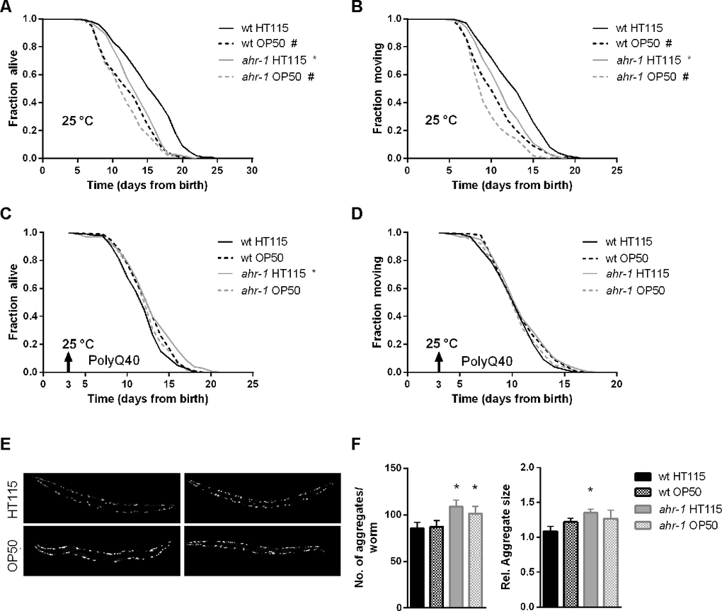 Given that temperature may affect aging and associated pathologies depending on the bacterial diet and genetic background [38, 45] we next tested whether the healthy aging phenotype of ahr-1 is also temperature-dependent. Despite the increased resistance to heat shock of ahr-1(ju145) mutants, and opposite to the lifespan at 20° C, ahr-1-depleted animals were short-lived on an HT115 diet at 25° C. Yet, again, this difference in the lifespan of wild-type and ahr-1 was abolished on the OP50 diet, which per se already shortened the lifespan at 25° C of wild-type animals (Figure 4A, 4B). The higher temperature also prevented the beneficial diet-dependent effects of loss of ahr-1 on life- and health-span in the polyQ strain (Figure 4C, 4D), while the number of polyQ aggregates increased according to the rise in temperature but still in a diet-independent manner (Figure 4E, 4F). Overall our data uncovered a new diet- and temperature-dependent effect of AhR in modulating aging and associated neuromuscular pathologies, which is nonetheless uncoupled from the age-dependent increase in protein aggregation.