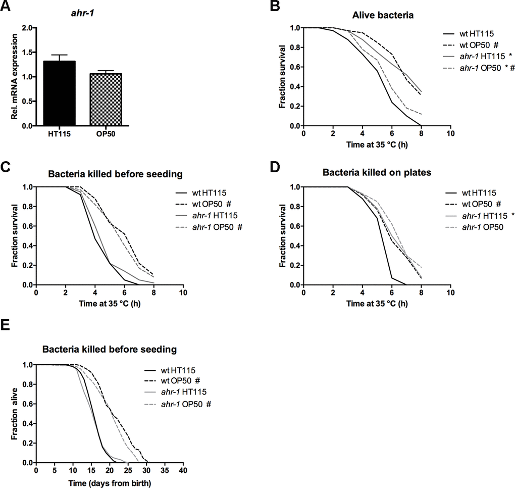 Bacteria were grown in LB medium at 37° C overnight. When using E. coli carrying vectors the LB medium was supplemented with 0.01 % of ampicillin and 0.0005 % of tetracycline. E. coli HT115(L4440), HT115(ahr-1), and OP50 were obtained from the Ahringer C. elegans RNAi library [77]. E. coli OP50(xu363) [41] was a gift from Shawn Xu.