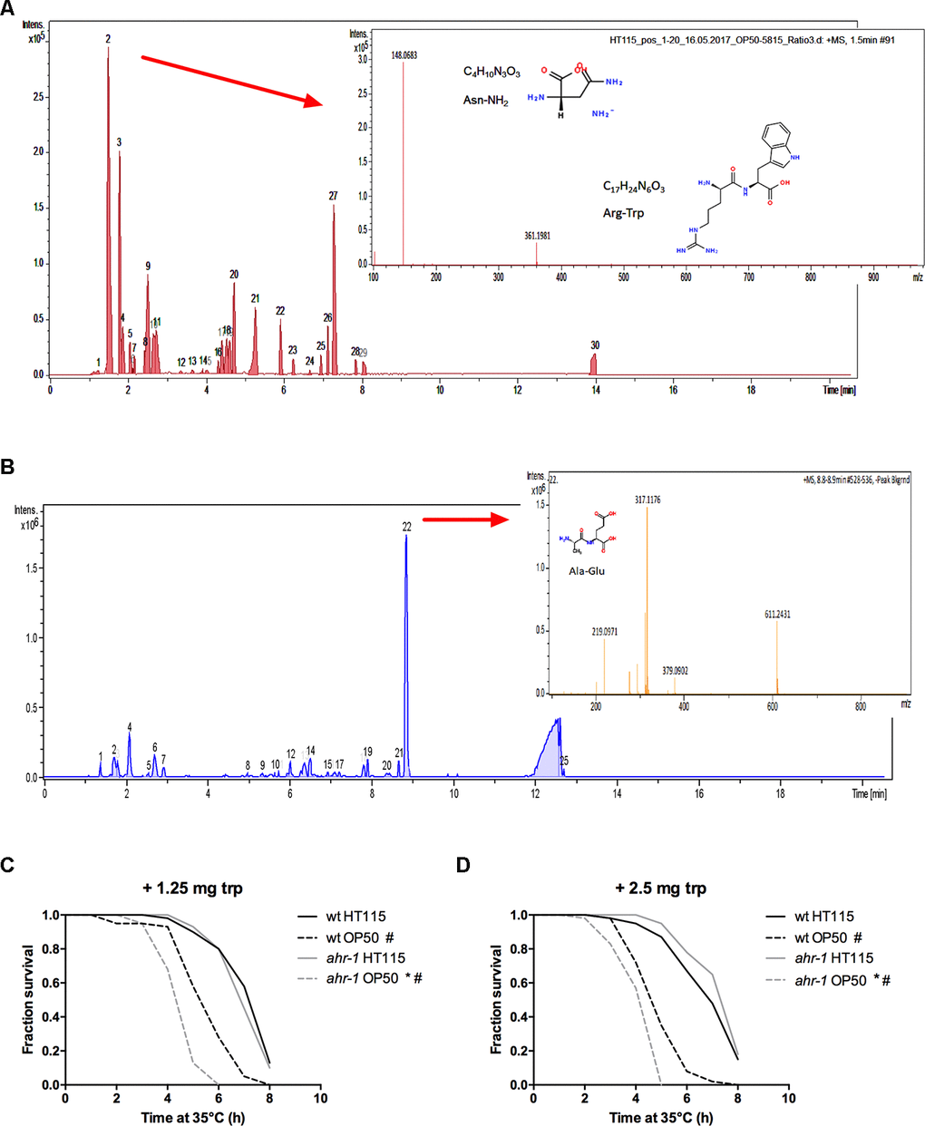 A mass spectrometric analysis of the two bacteria supernatants revealed on the one hand that the subtracted spectrum between HT115 and OP50 showed three prominent peaks (Figure 6A) with m/z 361 likely being an arginine-tryptophan (Arg-Trp) dipeptide. On the other hand, the medium of OP50 was enriched in an alanine-glutamate (Ala-Glu) dipeptide (Figure 6B). In mammals, Trp and its metabolites (such as indole) modulate AhR activity [23, 46, 47] and in C. elegans Trp was shown to abolish some of the different phenotypes observed between alive HT115 and OP50 [48]. We found that supplementation of L-tryptophan completely abolished the heat-stress resistance of ahr-1(ju145) on HT115 - and partially suppressed the difference also between wild-type and ahr-1(ju145) on OP50 (Figure 6C, 6D). Overall, these data point towards a potential role of Trp metabolism in ahr-1-bacteria-regulated age-associated phenotypes.