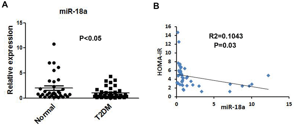 miR-146a was previously reported to be downregulated in serum [19] and peripheral blood mononuclear cells [20] from T2DM patients (Supplementary Figure 1); thus, we used miR-146a as a reference to assess serum miR-18a levels. Quantitative real-time PCR (qRT-PCR) indicated that serum miR-18a levels were lower in T2DM patients than in normal controls (Figure 1A). Moreover, miR-18a levels correlated negatively with homeostasis model assessment of insulin resistance values (R2=0.1043, P=0.03, Figure 1B). These findings strongly suggested that miR-18a influences insulin function and glucose homeostasis.