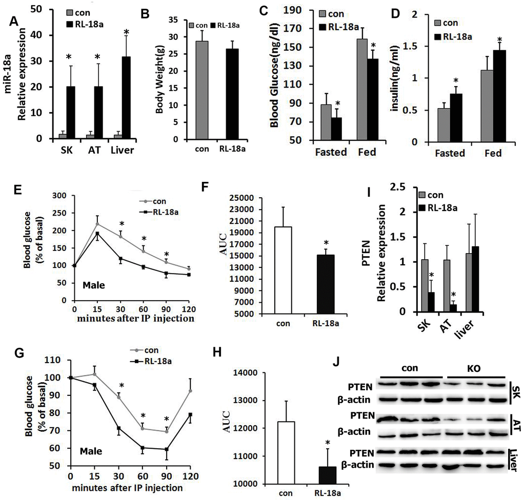 PTEN is a known negative regulator of insulin sensitivity [21]; thus, we used qRT-PCR (Figure 2I) and Western blotting (Figure 2J) to analyze PTEN expression in skeletal muscle, adipose tissue and liver samples from male RL-18a mice. As expected, PTEN levels in skeletal muscle and adipose tissue were lower in RL-18a mice than in control mice; however, there were no obvious changes in PTEN levels in the liver.
