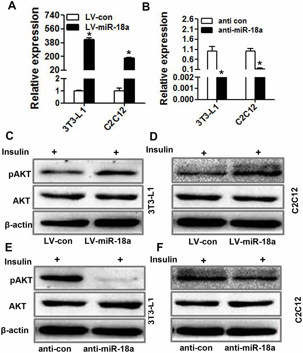 Insulin activity and sensitivity depend on PI3K-AKT pathway activation [22]. To further investigate the function of miR-18a in insulin target cells, we transiently transfected 3T3-L1 preadipocytes and C2C12 myoblasts with miR-18a mimics or inhibitors (‘anti-miR-18a’). The upregulation and inhibition of miR-18a expression in these cells was confirmed using qRT-PCR (Figure 3A, 3B). Western blotting indicated that the insulin-induced phosphorylation of AKT increased in 3T3-L1 and C2C12 cells transfected with miR-18a mimics (Figure 3C, 3D) but decreased in 3T3-L1 and C2C12 cells transfected with miR-18a inhibitors (Figure 3E, 3F). These results verified that miR-18a can enhance insulin sensitivity.