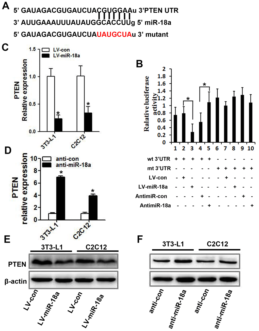 Next, we searched for potential targets of miR-18a, and found that its sequence complemented the 3’UTR of PTEN (Figure 4A). Accordingly, the mRNA and protein levels of PTEN decreased when miR-18a was overexpressed (Figure 4C, 4E) and increased when miR-18a was inhibited (Figure 4D, 4F) in 3T3-L1 and C2C12 cells.