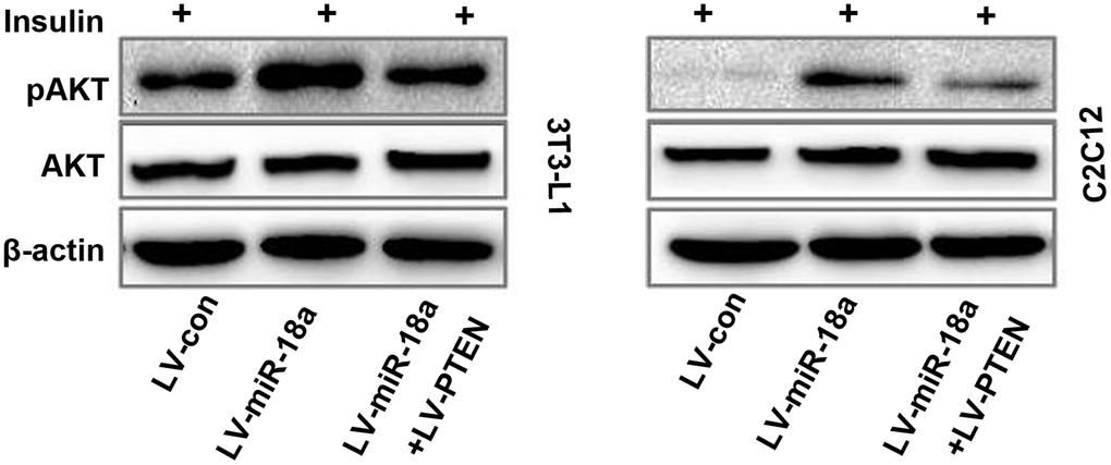 Finally, we evaluated whether ectopic PTEN expression would reverse the miR-18a-induced phosphorylation of AKT in insulin-treated cells. As anticipated, PTEN overexpression suppressed AKT phosphorylation in 3T3-L1 and C2C12 cells treated with miR-18a mimics (Figure 5). These results suggested that miR-18a enhances insulin sensitivity in insulin target cells by inhibiting PTEN.