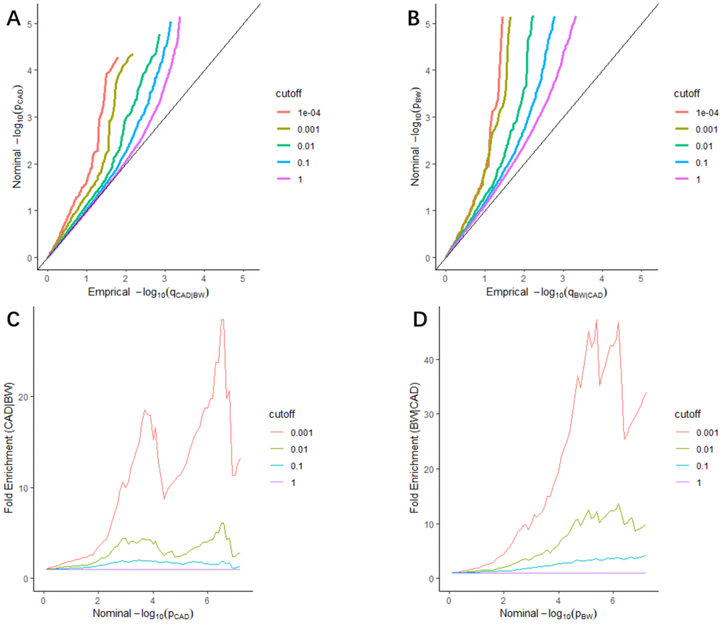 We constructed stratified Q-Q plots to estimate the pleiotropic enrichment in two related phenotypes using the “ggplot2” R package. In this study, -log10(p) which means the nominal p-value and -log10(q) which means the empirical quantile were plotted on the Y- and X-axes, respectively, at different significance levels (p ≤ 1, p ≤ 0.1, p ≤ 0.01, p ≤ 0.001, and p ≤ 0.0001). Under the null hypothesis, plots would fall on the line Y=X, and the enrichment of pleiotropic loci could be evaluated by the degree of leftward deviation from the null line. Additionally, we constructed fold-enrichment plots as a supplement for the Q-Q plots. Fold-enrichment and -log10(p) were plotted on the Y- and X-axes, respectively, at different significance levels (p ≤ 1, p ≤ 0.1, p ≤ 0.01, and p ≤ 0.001) for CAD and BW. Pleiotropy could be visually observed via an upward deflection from the baseline (for the group including all SNPs (p = 1)).