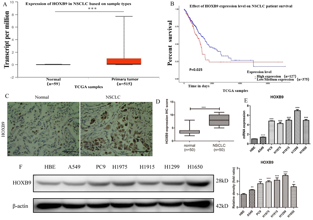 Analysis of clinical NSCLC samples and normal lung tissues in the TCGA database showed that HOXB9 was highly expressed in NSCLC (Figure 1A), and correlated with lower overall survival (OS) (Figure 1B). HOXB9 expression results were validated by IHC in matched NSCLC and normal lung samples (n = 50) from patients with NSCL (Figure 1C, 1D). Using a human bronchial epithelial cell line (HBE) as control, we also confirmed by western blot and qPCR high expression of HOXB9 in several NSCLC cell lines (Figure 1E, 1F). These findings would suggest that HOXB9 has tumor-promoting functions and may confer poor prognosis in NSCLC.