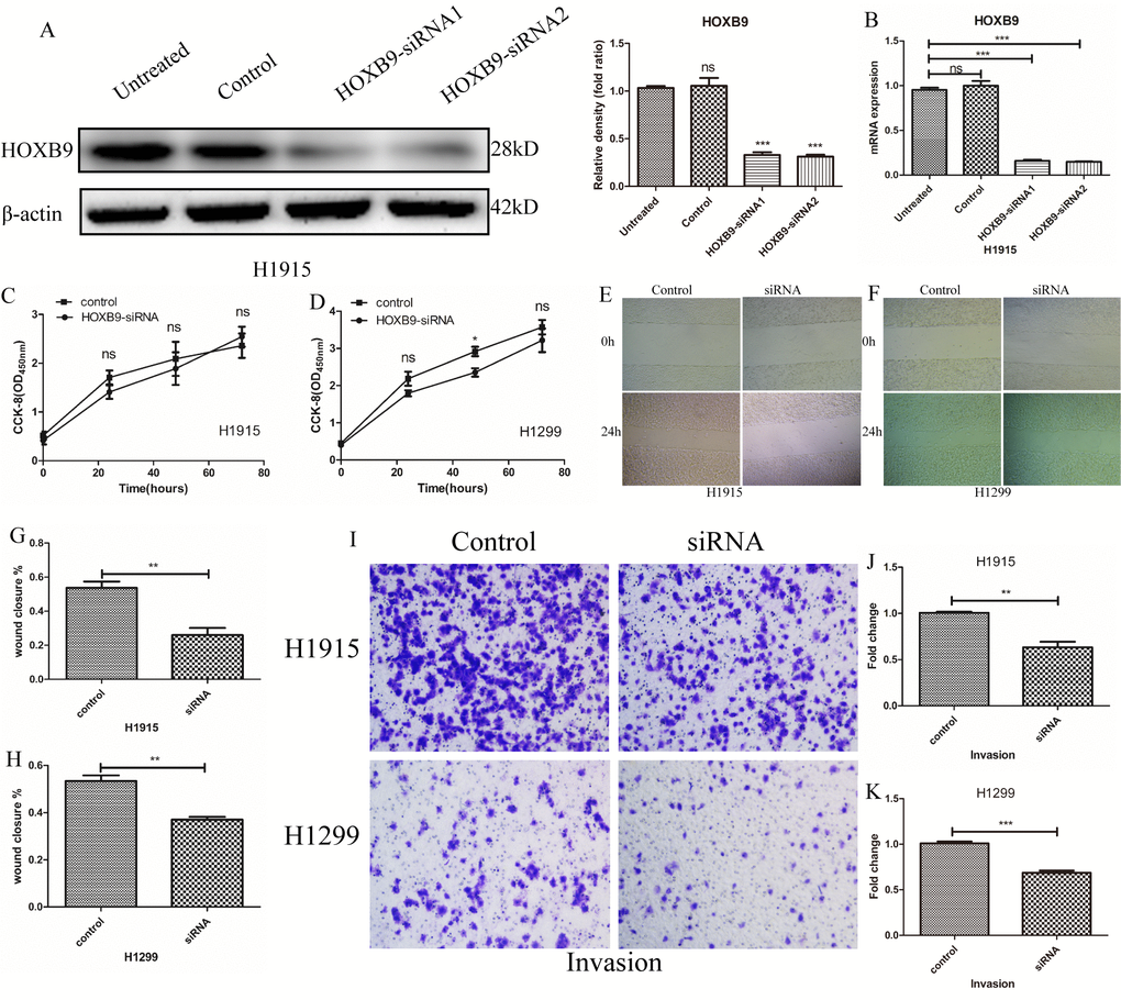Knockdown experiments were conducted in two NSCLC cell lines showing high HOXB9 expression (H1915 and H1299) by transfecting HOXB9-siRNA (Figure 2A, 2B). CCK-8 proliferation assays showed no significant growth differences between HOXB9-knockdown cells and control cells transfected with scrambled siRNA up to 72 h post-transfection (Figure 2C, 2D). In contrast, both migration and invasion, assessed respectively by wound healing (Figure 2E–2H) and Transwell Matrigel (Figure 2I–2K) assays, were markedly decreased 24 h after HOXB9 knockdown.