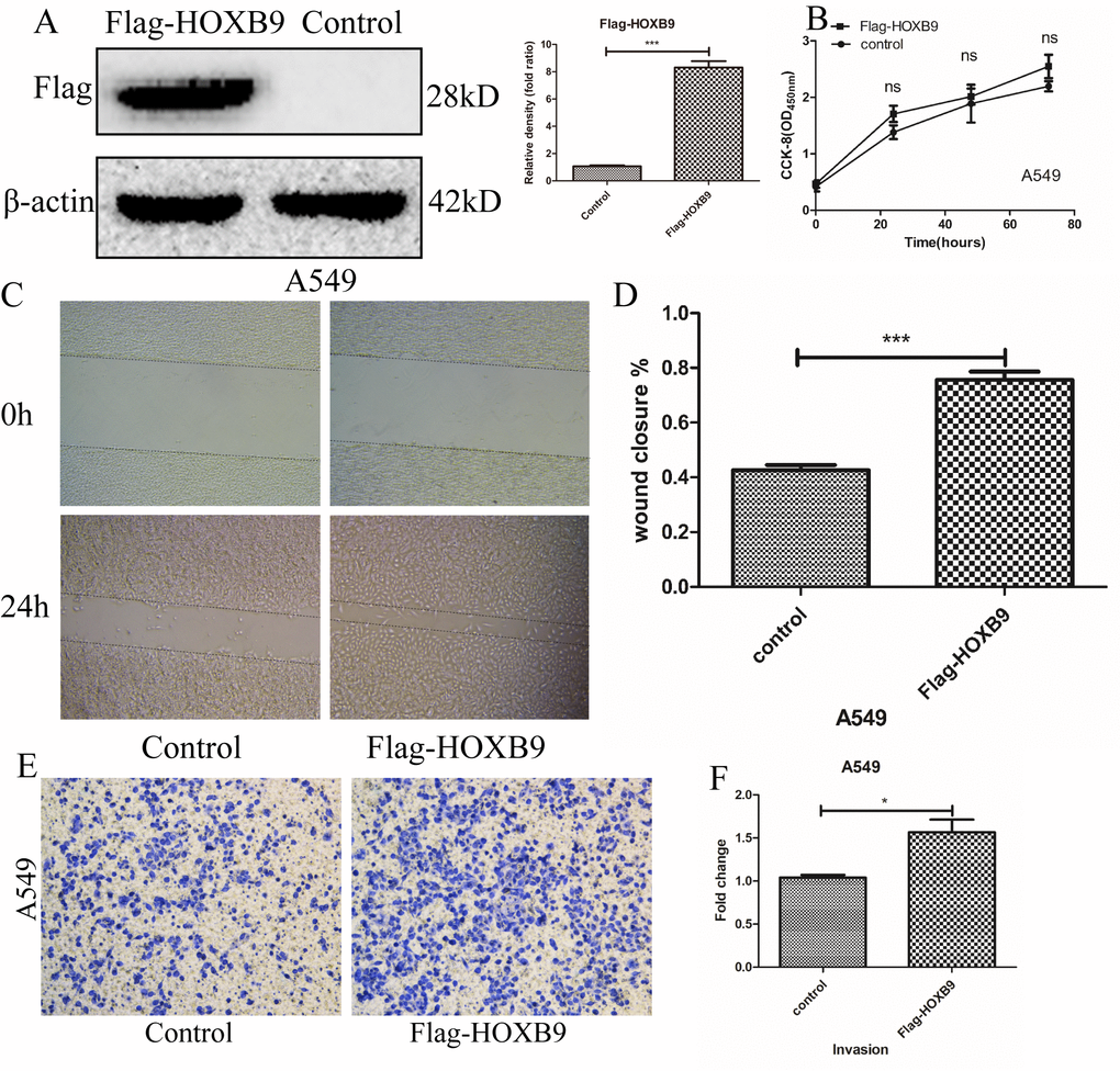 Next, we overexpressed HOXB9 in A549 cells (showing low HOXB9 expression) by transfecting vectors encoding Flag-HOXB9 (Figure 3A). Consistent with the above results, experiments showed that HOXB9 overexpression did not affect cell proliferation (Figure 3B), whereas migration and invasion were both increased significantly (Figure 3C–3F). In addition, we performed colony-forming assays which confirmed that HOXB9 expression does not influence proliferation in NSCLC cells (Supplementary Figure 1A, 1B). Preliminary results indicate that HOXB9 promotes the migration and invasion of non-small cell lung cancer.