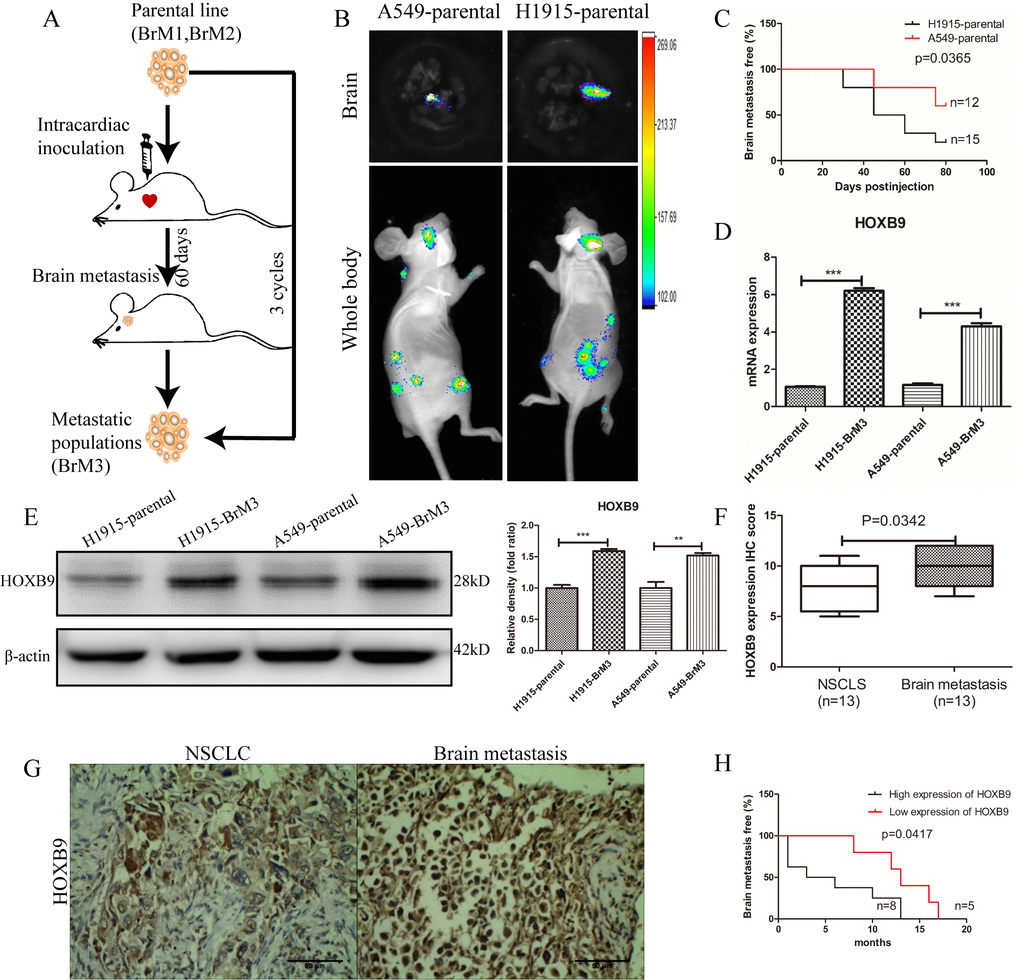 Considering that HOXB9 expression increased migration and invasion potential in NSCLC cells, we hypothesized that it may facilitate brain metastasis formation. To test this hypothesis, H1915 and A549 cells, with high- and low-HOXB9-expression respectively, were transduced with the luciferase gene and injected intracardially into nude mice. The resulting brain metastases were excised, and by in vitro propagation and two rounds of in vivo selection [30] two brain metastatic NSCLC populations (A549-BrM3 and H1915-BrM3) were isolated (Figure 4A). Sixty days after tumor implantation, bioluminescence imaging (BLI) showed stronger brain metastatic activity and shorter brain metastasis-free survival in mice injected with H1915 cells, compared to those injected with A549 cells (Figure 4B, 4C). The resulting brain metastases were excised, and by in vitro propagation and two rounds of in vivo selection [30] two brain metastatic NSCLC populations (A549-BrM3 and H1915-BrM3) were isolated. Western blot and qPCR assays showed that the expression of HOXB9 in BrM3 cells was higher than in the corresponding parental cells (Figure 4D, 4E). Moreover, comparable results were obtained through IHC in matched tumor samples from primary NSCLC and brain metastases obtained from 13 clinical cases (Figure 4F, 4G and Supplementary Table 1). Among these patients, those with low HOXB9 expression (n = 5) had longer brain metastasis-free survival than those with high HOXB9 expression (n = 8) (Figure 4H). These results of animal and clinical experimentation suggest that HOXB9 has crucial role in brain metastases from non-small cell lung cancer.