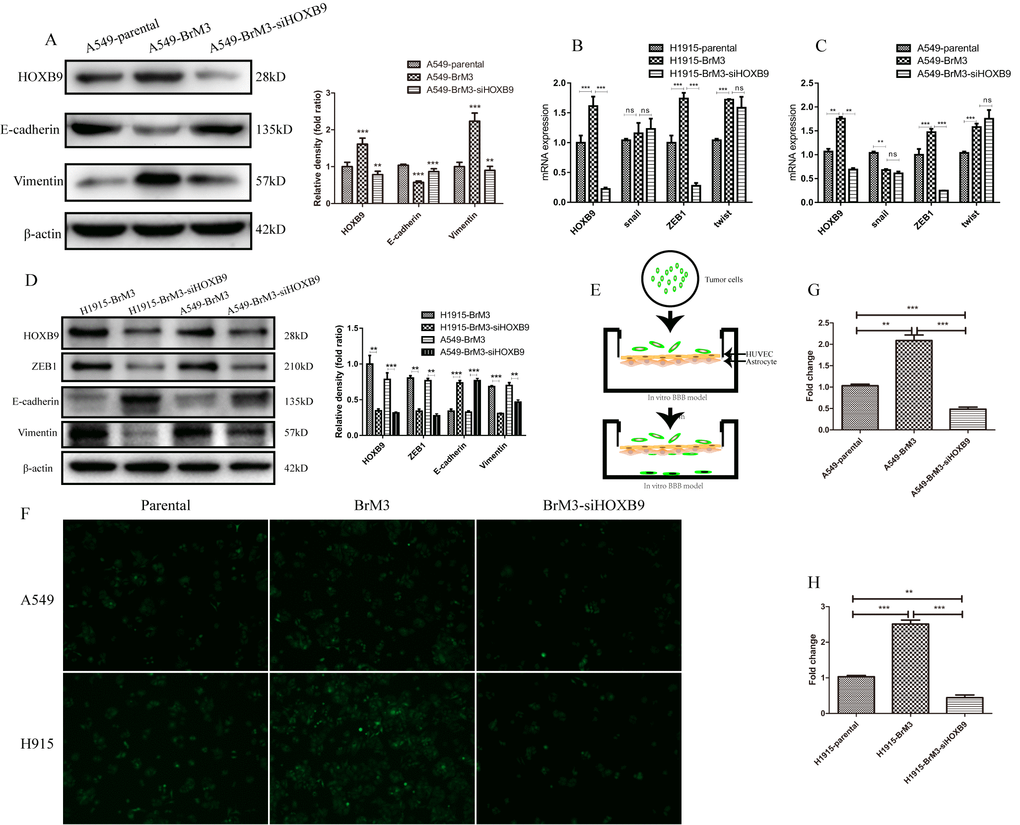To further verify the metastatic potential of BrM3 cells, we co-cultured human umbilical vein endothelial cells (HUVECs) and human astrocytes (HA) on opposite sides of Transwell membranes to construct an in vitro model of the BBB (Figure 5E). After CellTracker Green CFMDA labeling, parental A549 and H1915 cells, as well as their control- or siHOXB9-transfected BrM3 counterparts, were alternatively placed in the upper chamber (i.e onto the HUVEC monolayer) of the inserts. The lower chamber was filled with media containing 30% FBS, and after 24-h incubation the number of tumor cells crossing into the lower chamber was recorded by confocal microscopy. Compared to parental cells, the number of BrM3 cells that passed through the BBB model was significantly higher. However, this number was significantly weakened when HOXB9 was knocked down (Figure 5F–5H). According to the experimental results shown above, HOXB9 can enhance the ability of cancer cells to pass through the blood-brain barrier.