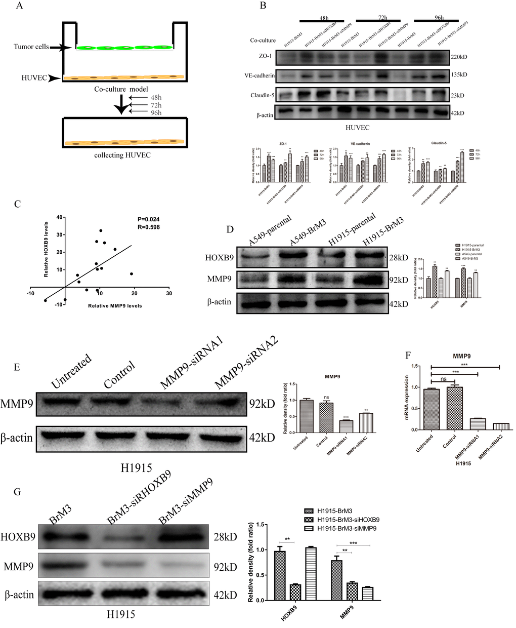 Matrix metalloproteinase 9 (MMP9), a member of the zinc- and calcium-dependent MMP family with endopeptidase activity, can degrade most extracellular matrix components and decrease the expression of junctional proteins to increase BBB permeability. Therefore, we examined through western blot whether MMP9 expression is upregulated by HOXB9 overexpression in NSCLC cells. As shown in Figure 6D, higher MMP9 expression was detected in BrM3 cells (showing high HOXB9 expression) compared with their parental counterparts. Moreover, this result was consistent with analysis of MMP9 and HOXB9 co-expression in primary NSCLC from a public GEO dataset (GSE74706; Figure 6C). To verify these data, HUVECs were co-cultured with BrM3 cells in which MMP9 was knocked down via siRNA (Figure 6E, 6F). Western blot assays showed that MMP9 silencing in BrM3 cells restored the expression of ZO-1, claudin-5, and VE-cadherin in HUVECs (Figure 6B). We found that the expression of MMP9 was downregulated by HOXB9 silencing, but MMP9 silencing had little effect on the expression of HOXB9 (Figure 6G). These data suggest that HOXB9 is a positive regulator of MMP9 expression in NSCLC cells, and underscore a potential mechanism by which HOXB9 overexpression promotes metastatic spread of NSCLC cells to the brain.