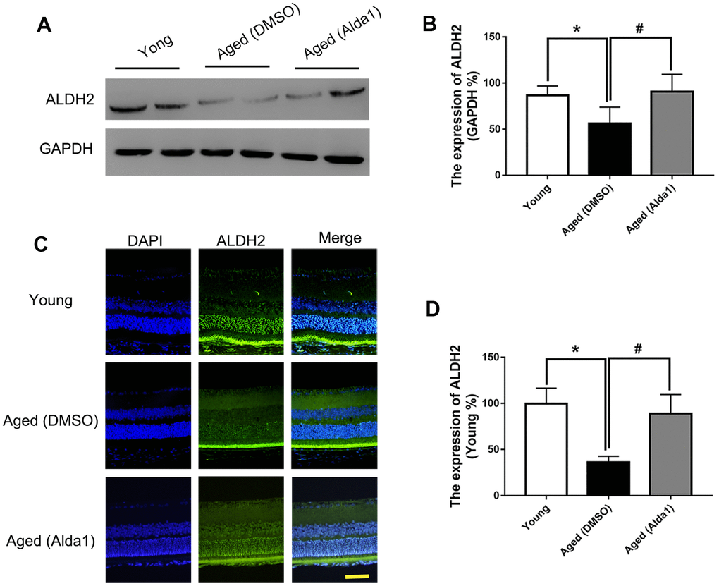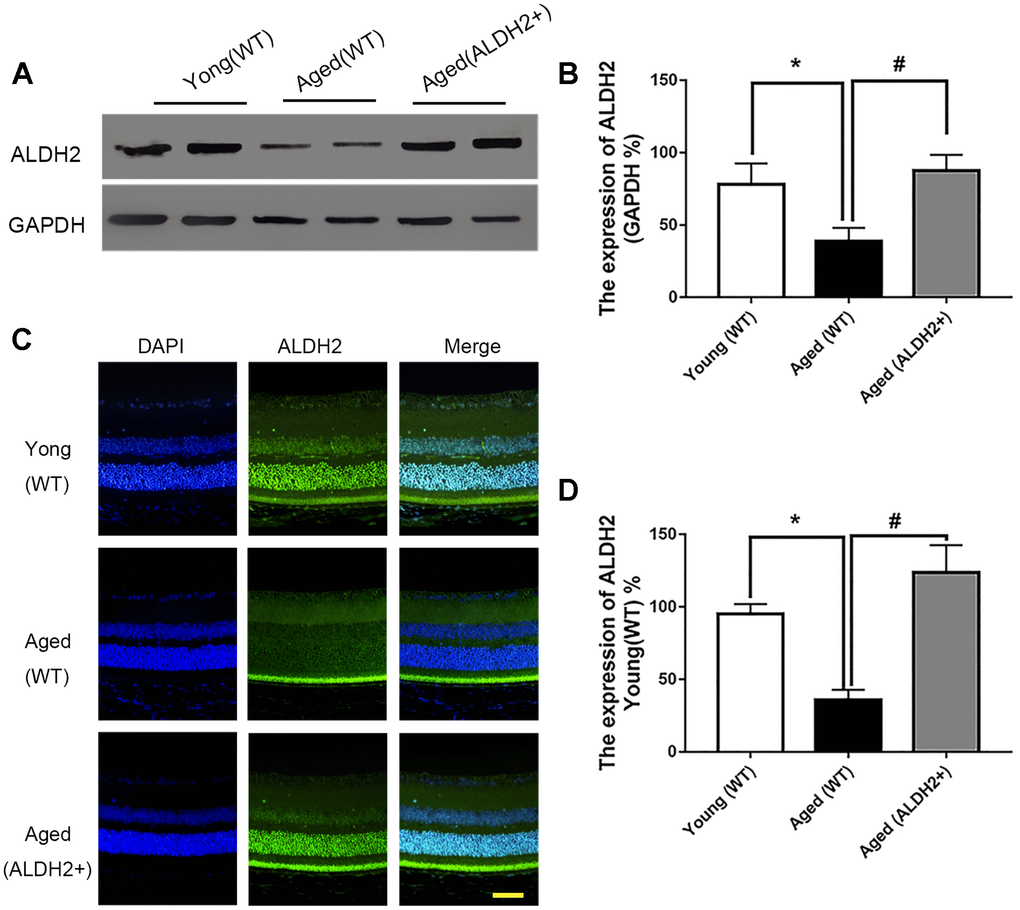 Considering that ALDH2 could alleviate OS damage, ALDH2 overexpression in aged mice (transgenic mice controlled by EF1α and chicken β-actin promoters) and aged mice treated with the ALDH2 activator Alda1 (N-[1,3-benzodioxol-5-ylmethyl]-2,6-dichlorobenzamide) were examined to evaluate the effect of ALDH2 on aged mice retinal function and structure, and explore the underlying mechanisms.