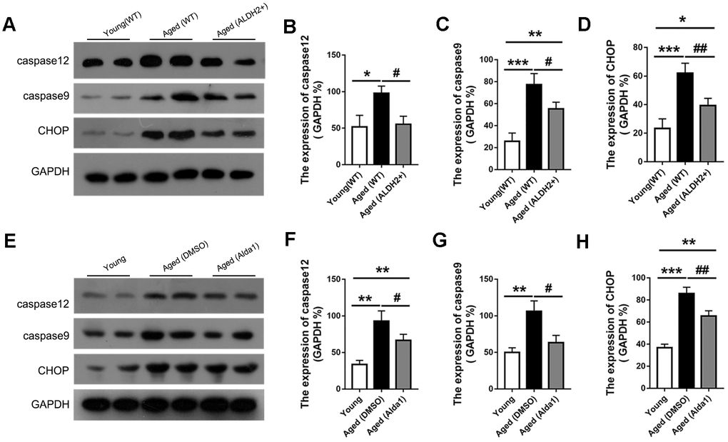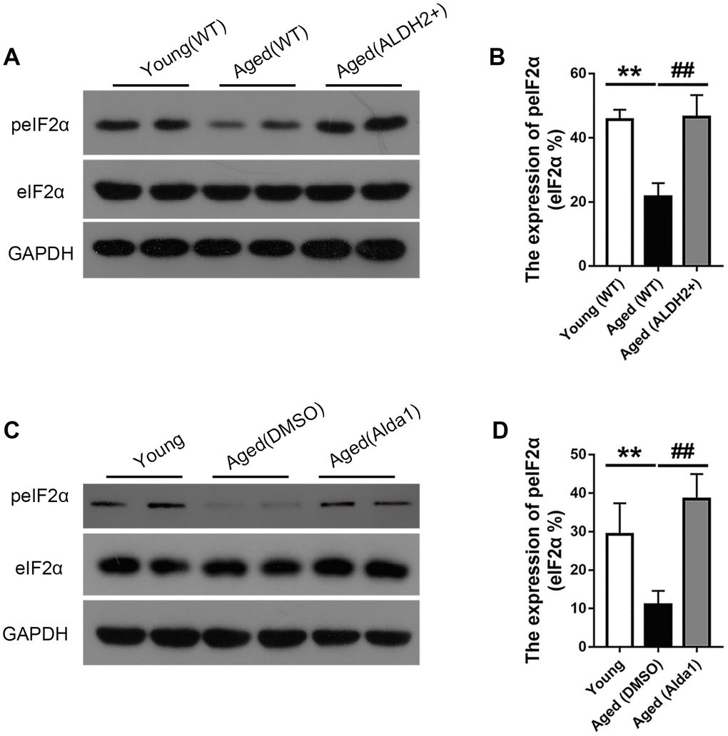Moreover, the expression of peIF2α was obviously reduced in the aged (WT) group compared with that in the young (WT) group (P<0.05), while the expression of peIF2α was increased in the aged (ALDH2+) group compared with that in the aged (WT) group (P<0.05) (Figure 10A, 10B). Furthermore, the expression of peIF2α was decreased in the aged (DMSO) group compared with that in the young group (P<0.05), while its expression was increased in the aged (Alda1) group compared with that in the aged (DMSO) group (P<0.05) (Figure 10C, 10D).