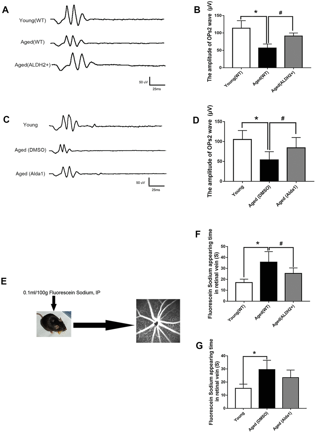 To explore the retinal vessel protective effect of ALDH2, retinal vessel related ERG response (oscillatory potentials, OPs response) and FFA detection (the operation procedure pattern diagram was showed in Figure 4E) were performed. The OPs wave, as an ERG component, could be used to indirectly evaluate retinal vessel function, because retinal amacrine cells are accompanied by retinal vessels.