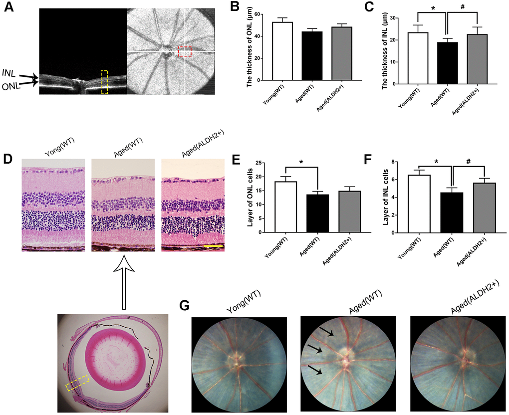 As shown in Figure 5B, 5C, the thickness of the INL detected by OCT was significantly decreased in the aged (WT) group compared with the young (WT) group (P<0.05). Interestingly, the thickness of INL was increased in the aged (ALDH2+) group compared with the aged (WT) group (P<0.05). However, there were no significant differences in the ONL thickness among each group (P>0.05). As shown in Figure 5D–5F, HE staining showed that the ONL cell and INL cell layers were significantly reduced in the aged (WT) group compared with those in the young (WT) group (all P<0.05). Furthermore, the INL cell layer was more in the aged (ALDH2+) group than the aged (WT) group (P<0.05). Moreover, the fundus photograph revealed a depigmentation change in the aged (WT) group but little depigmentation change in the aged (ALDH2+) group (Figure 5G).
