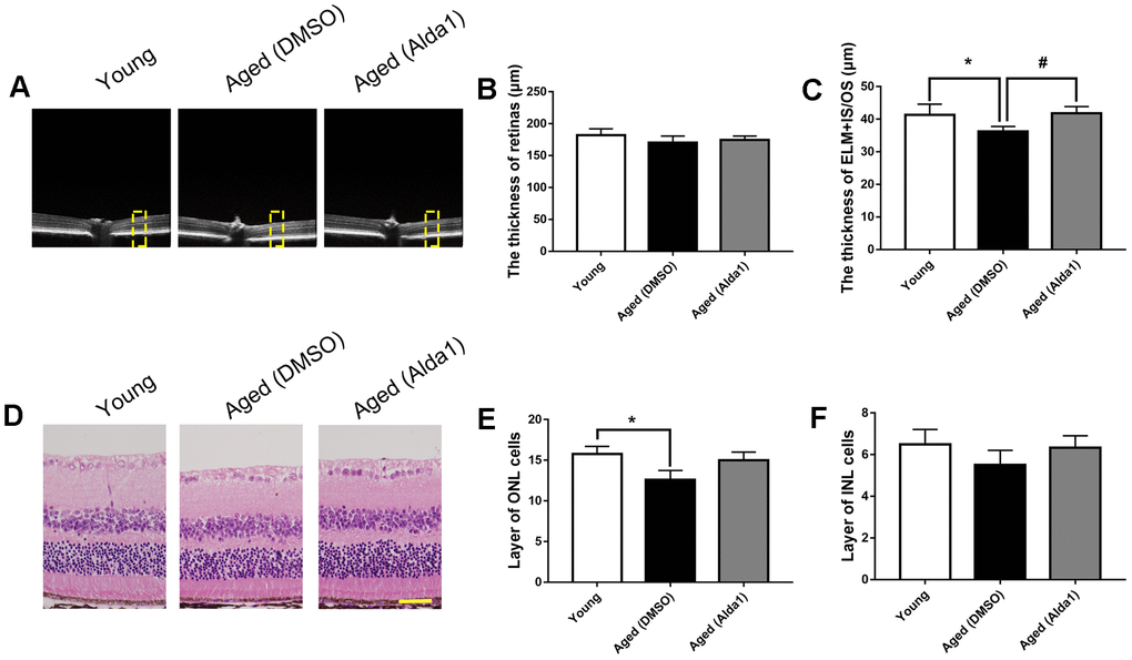 Regarding the ALDH2 agonist, the total retinal thickness among the young, aged (DMSO) and aged (Alda1) groups was not significantly different (all P>0.05). However, the thickness of ELM+IS/OS was reduced in the aged (DMSO) group compared with the young group (P<0.05), while it was increased in the aged (Alda1) group compared with that in the aged (DMSO) group (P<0.05) (Figure 6A–6C). Moreover, HE staining showed that the number of INL cell layers was significantly reduced in the aged (DMSO) group compared with the young group (P<0.05). For the number of ONL cell layers, there existed no significant difference among the groups (Figure 6D–6F).