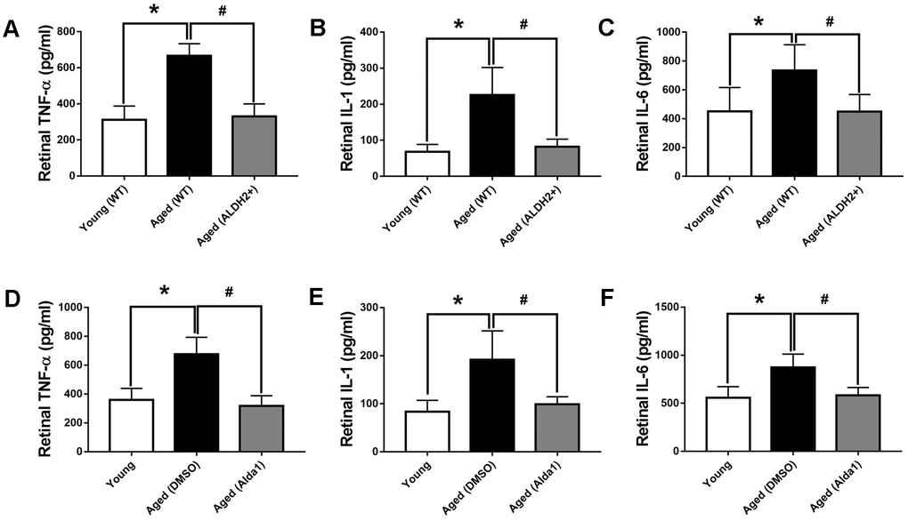 In aging process, oxidation imbalance, accompanied by free radicals accumulation, affects retina working regularly. Retinal inflammatory factor, including tumor necrosis factor-α (TNF-α), interleukin-6 (IL-6) and interleukin-1 (IL-1) were detected to evaluate oxidative stress damage with aging. As shown in Figure 7A–7C, the expression levels of retinal TNF-α, IL-6 and IL-1 were significantly increased in the aged (WT) group compared with those in the young (WT) group, respectively (all P<0.05). However, the expression of retinal TNF-α, IL-6 and IL-1 were decreased in the aged (ALDH2+) group compared with those in the aged (WT) group, respectively (all P<0.05). As for the agonist intervention experiment, the expression of retinal TNF-α, IL-6 and IL-1 were increased in the aged (DMSO) group compared with those in the young group, respectively (all P<0.05). Additionally, the expression of retinal TNF-α, IL-6 and IL-1 were decreased in the aged (Alda1) group compared with those in the aged (DMSO) group, respectively (all P<0.05) (Figure 7D–7F).
