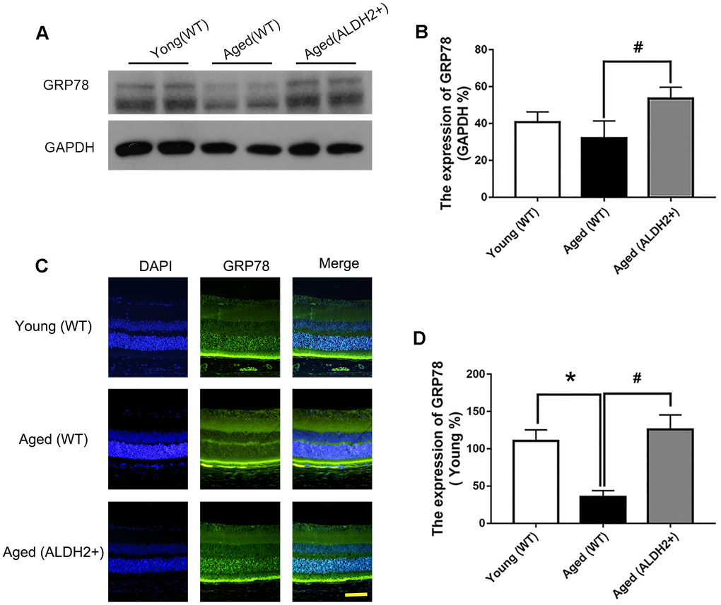 To determine whether ALDH2 was involved in the enhancement of UPRER during the retinal aging process, the retinal UPRER-related proteins GRP78, eIF2α and phosphorylated eIF2α (peIF2α) were assessed. As shown in Figure 8A, 8B, GRP78 expression was decreased in the aged (WT) group compared with the young (WT) group, as determined by western blotting (P<0.05). Additionally, GRP78 expression was increased in the aged (ALDH2+) group compared with the aged (WT) group, as confirmed by western blotting analysis (P<0.05). Immunofluorescence staining showed that GRP78 was highly expressed in ONL, which was consistent with the western blotting results (Figure 8C, 8D).