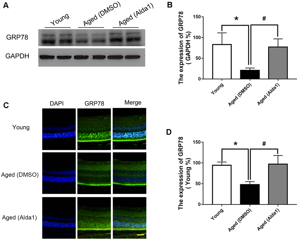 Additionally, western blotting (Figure 9A, 9B) and immunofluorescence staining (Figure 9C, 9D) results showed that the expression of GRP78 was dramatically decreased in the aged (DMSO) group compared with that in the young group (P<0.05), while the expression of GRP78 was dramatically increased in the aged (Alda1) group compared with the aged (DMSO) group (P<0.05).
