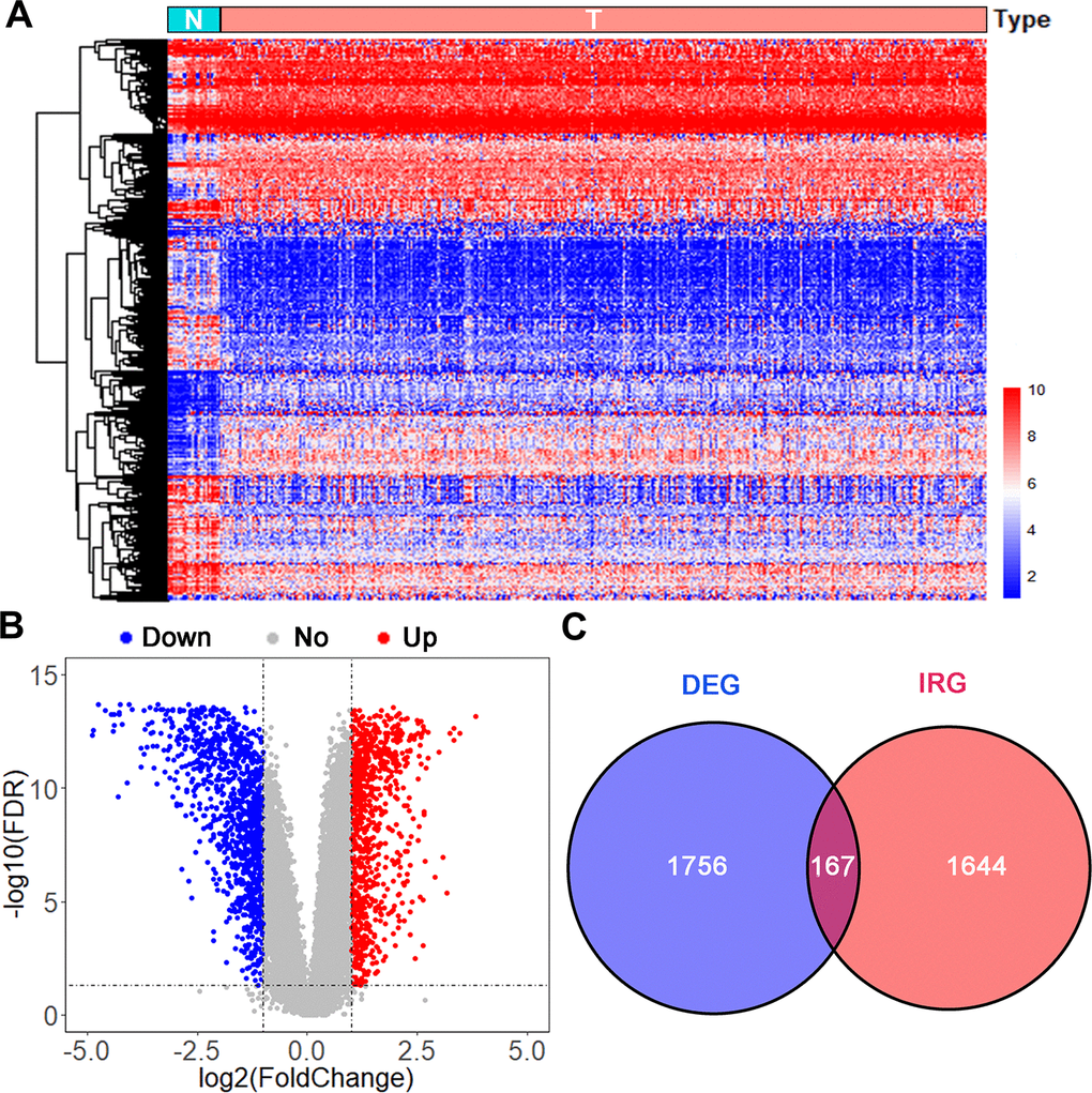 Data on 403 UBC cases were downloaded from TCGA (TCGA-BLCA dataset) and randomly split into a training group (n=202) and the testing group (n=201). Another independent UBC dataset (GSE13507) downloaded from GEO constituted an independent testing set (n=165). Detailed demographics and clinicopathologic characteristics of patients are listed in Table 1. After applying cutoff thresholds of |log2FC|>1 and FDR<0.05, 1,924 differentially expressed genes between normal urothelium tissues and bladder tumors from TCGA and GTEx were identified using the Wilcoxon signed-rank test. Of these, 870 were upregulated and 1,054 downregulated (Figure 1A, 1B). 158 differentially expressed IRGs (DEIRGS) were extracted from these gene lists (Figure 1C).