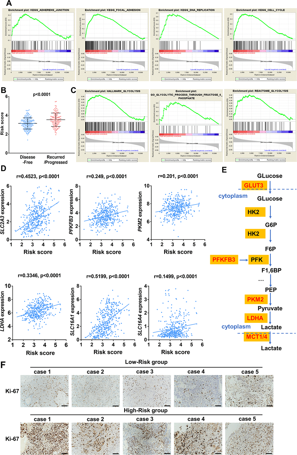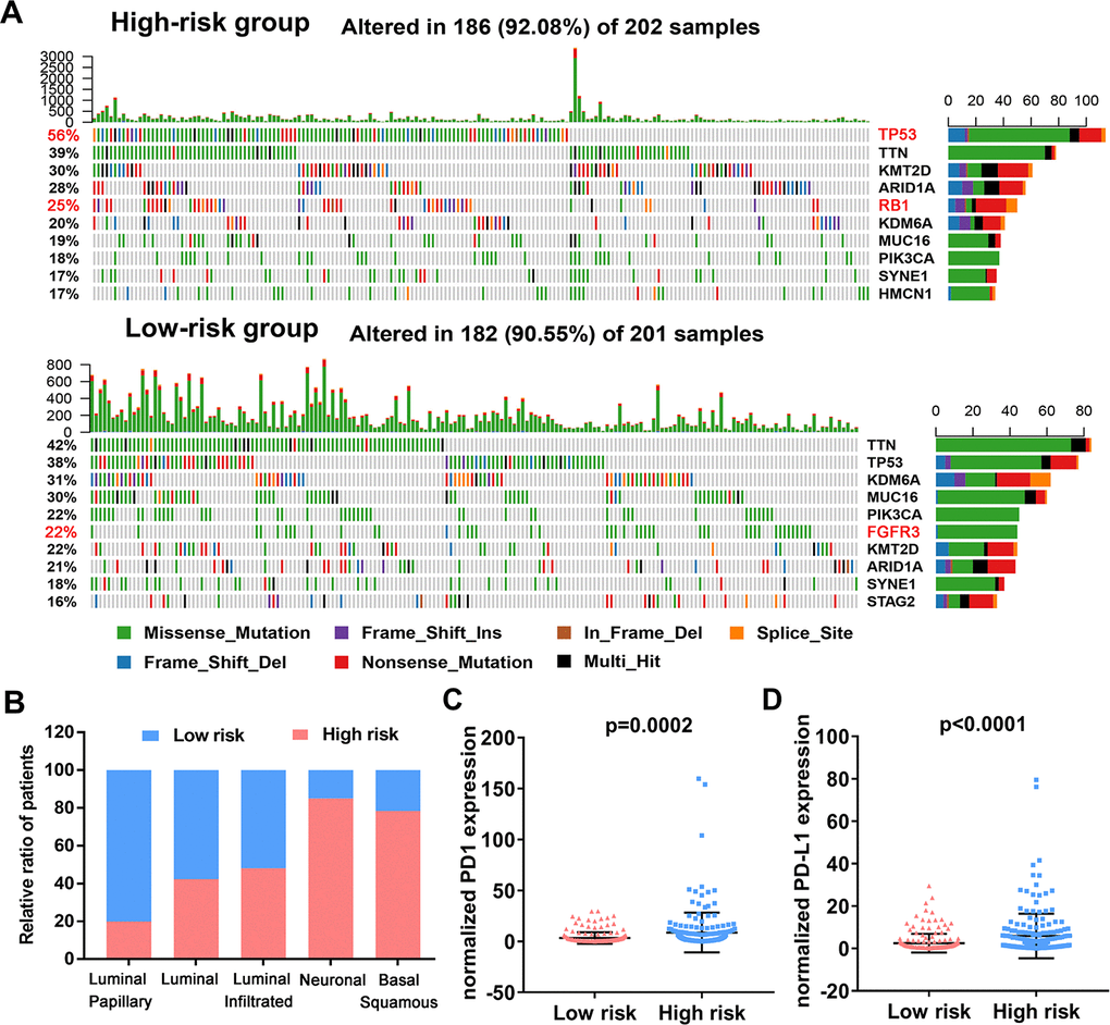 To investigate the mechanisms underlying this risk model, we analyzed the UBC mutation profiles. Interestingly, we uncovered a subgroup with low-risk scores that featured higher FGFR3 mutation rates. Moreover, for the luminal papillary subtype most patients have low risk scores [5]. The luminal papillary subtype cohort was characterized by papillary morphology, lower stage, lower risk for progression and enrichment with FGFR3 mutations. These results suggest tyrosine kinase inhibitors against FGFR3 as a therapeutic option in patients with low risk scores. Patients with high risk score accounted for the bulk of basal-squamous and neuronal subtypes, which had high rates of TP53 and RB1 mutations, suggesting the worse survival, making it significant to recognize clinically. In addition, high levels of immune markers and mesenchymal expression signature in basal-squamous subtype suggested resistance to cisplatin-based chemotherapy, and sensitivity to immune checkpoint inhibition. However, despite high PD1/L1 expression in high-risk tumors, glycolytic pathways also simultaneously enriched. Cancer cells are known to reprogram their metabolism by upregulating glucose uptake. Enhanced glycolysis within the TME results in an accumulation of lactic acid [50] and glucose-deprived niche can directly inhibit glycolysis in immune cells, thus hindering antitumor immune responses. Taken together, these results suggest that the immune-related risk signature may help personalize therapies. Glycolysis inhibition coupled with immunotherapy design may be a rational approach to improve the efficacy of ICIs.