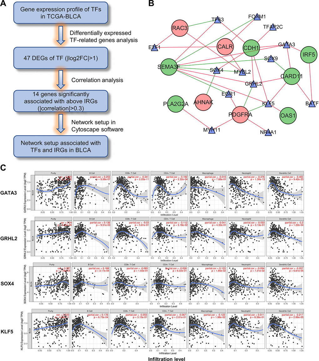 To elucidate the mechanisms involved in the regulation of these immune-related genes, we examined differentially expressed transcription factors and correlation analysis of DEGs between the 2 gene lists (Figure 12A). Construction of the regulatory network revealed KLF5, SOX4, GRHL2 and GATA3 as the nodes with highest connectivity (Figure 12B). Interestingly, further investigation via Tumor Immune Estimation Resource (TIMER) showed these transcriptional factors, particularly GATA3, were closely related to the immune cell infiltration of tumors (Figure 12C). These results indicate that the 4 genes may involve in the upstream regulation of the ten IRGs and influences the immune status of the tumor microenvironment.