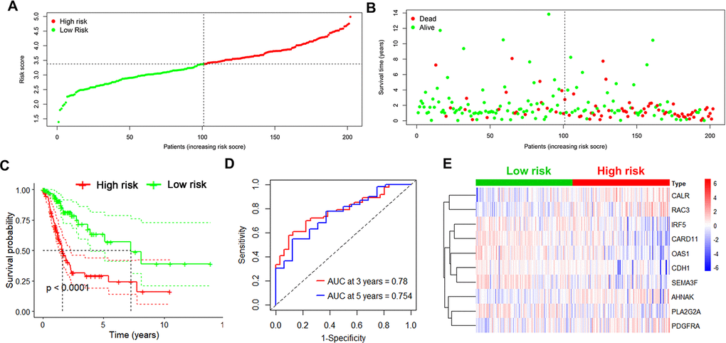 Next, the risk score in each UBC case was calculated and ranked based on its expression of the 10 risk genes. The UBC cases in the training cohort were divided into a high-risk group (n =101) and a low-risk group (n=101) based on the median risk score (Figure 3A). The survival status of the UBC cases was visualized on dot plots (Figure 3B). Kaplan-Meier analysis revealed significantly different survival rates between the two groups (p<0.05; Figure 3C). The AUC value for the risk model was 0.780 at 3 years and 0.754 at 5years for overall survival (OS; Figure 3D). Expression levels of the risk genes in the 2 groups were visualized by heatmaps (Figure 3E).