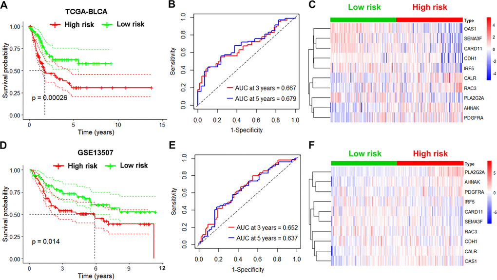 Next, we tested the robustness of the 10-gene signature on 2 independent datasets. First, we repeated the analysis as described above in the internal TCGA testing group and observed lower survival rates for high-risk UBC cases relative to low-risk ones (p<0.05; Figure 4A). ROC curve analysis of overall survival revealed that the value of the AUC was 0.667 for 3 years and 0.679 for 5 years (Figure 4B). Risk genes expression levels in the internal testing group were visualized on heatmap (Figure 4C). Next, we validated the 10-gene risk model in the external GEO testing dataset. The cases were first grouped into a low-risk group (n=82) and a high-risk group (n=83) based on median risk scores. Interestingly, cases with high-risk had shorter median survival relative to low-risk ones (p<0.05; Figure 4D). In the GEO dataset, the AUC values were 0.652 at 3 years and 0.637 at 5 years (Figure 4E). The expression of risk genes in the GEO testing cohort were visualized in heatmap (Figure 4F). These data indicate that the immune-related risk model accurately predicts UBC prognosis.