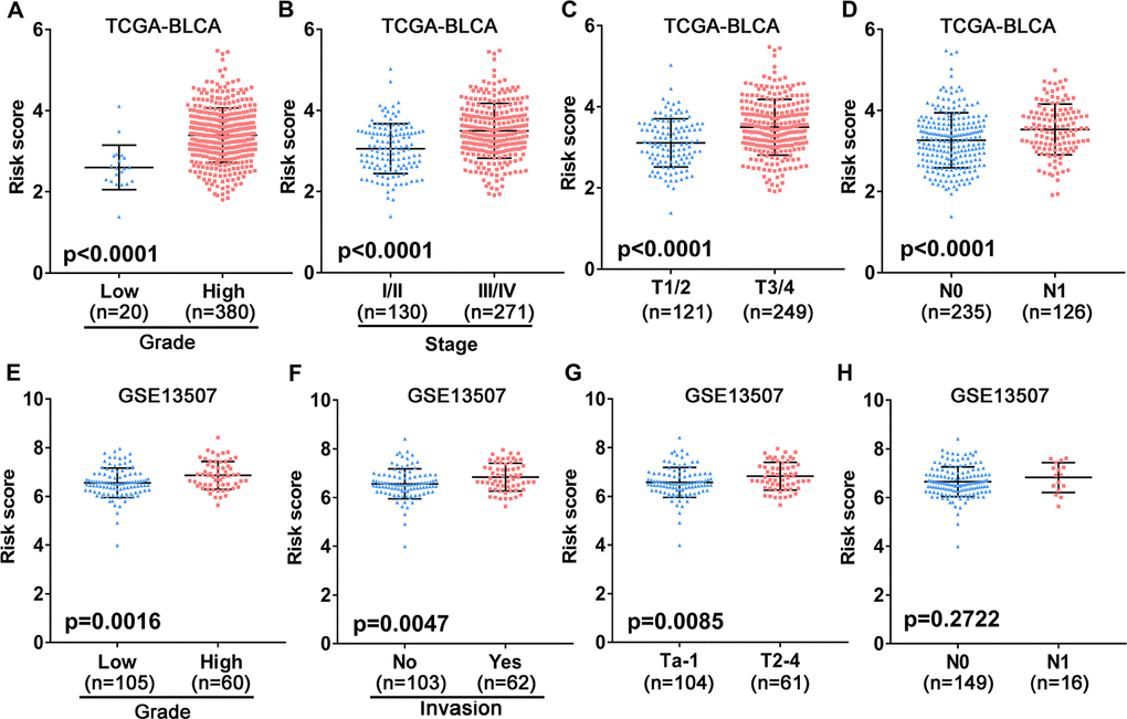 To assess the clinical value of the immune gene-related signature, we evaluated the association between the 10-gene risk model and UBC clinicopathological features. This analysis showed that signature risk score positively correlates with grade, clinical stage, pathological T stage and metastatic lymphatic status (Figure 5A–5D). In the independent GEO cohort, the 10-IRG risk score was significantly elevated in high grade and high muscle-invasive UBC cases relative to low grade and superficial UBCs (Figure 5E–5G). No difference was observed between risk score and N stage (Figure 5H). These data suggested that our IRG risk model closely correlates with clinical UBC features.