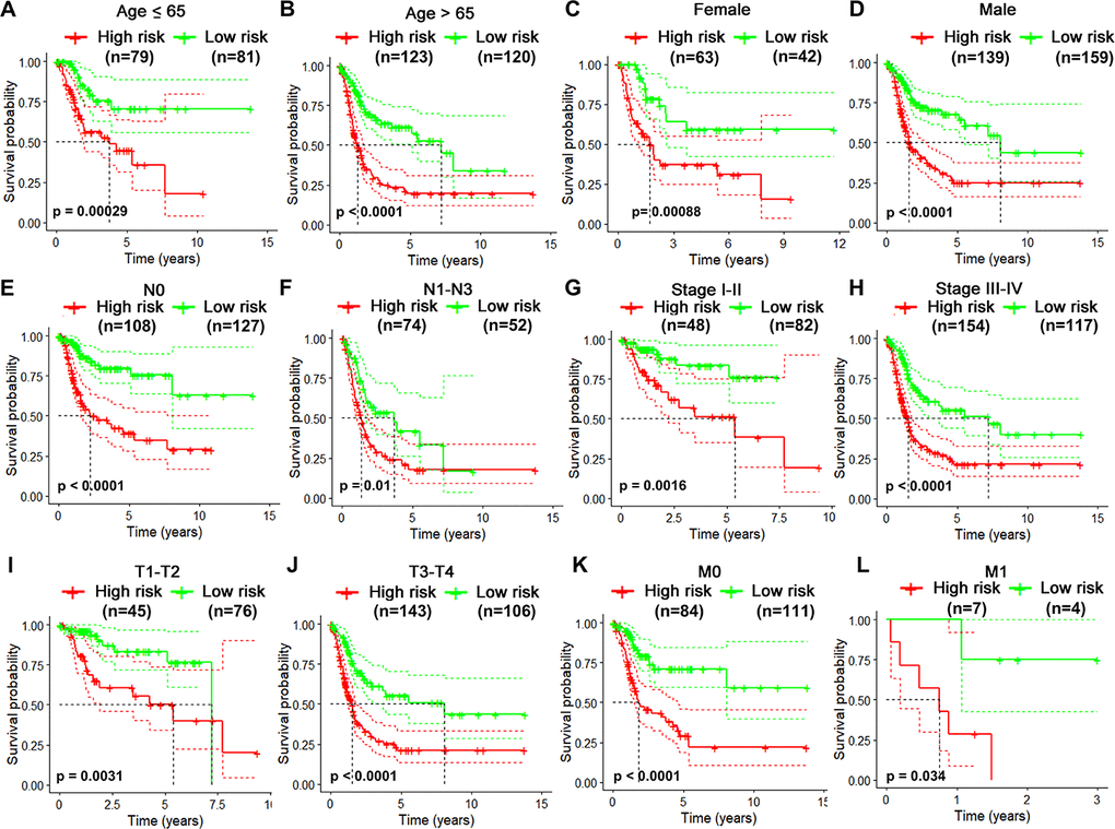Considering different clinical characteristics of bladder cancer patients, we performed a stratified analysis and subgroup analysis was stratified by age, gender, N stage, pathological stage, T stage and metastatic status (Figure 6A–6L). As shown in the Kaplan-Meier curves, we found that the survival rates of the high-risk groups had significantly decreased than the low-risk groups in any group. Thus, the predict power of overall survival by the 10-gene risk model was unrestricted to specific subgroups.