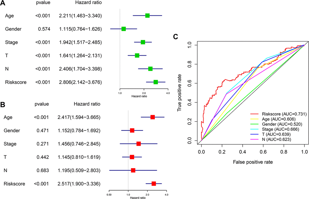 We then analyzed the relationship between OS, clinicopathological parameters, including gender, age, clinical stage, pathological features (T and N status), and risk score of the immune-related risk model in the TCGA cohort. Univariate Cox regression analysis revealed that the above clinical variables correlate with UBC survival, except gender and risk score (p<0.05; Figure 7A). Multivariable Cox regression analysis showed that this risk model acts as an independent prognostic indicator in the TCGA (Figure 7B). Next, ROC analysis was done to evaluate the risk signature specificity and sensitivity in predicting OS relative to clinicopathological parameters. Interestingly, risk score of the 10 genes exhibited better AUC relative the clinicopathological parameters (Figure 7C), indicating that the risk model independently predicts UBC survival. In the c-index analysis (Table 3), the risk model showed better predictive ability than that of the TNM stage in the training, validation, and entire cohorts.
