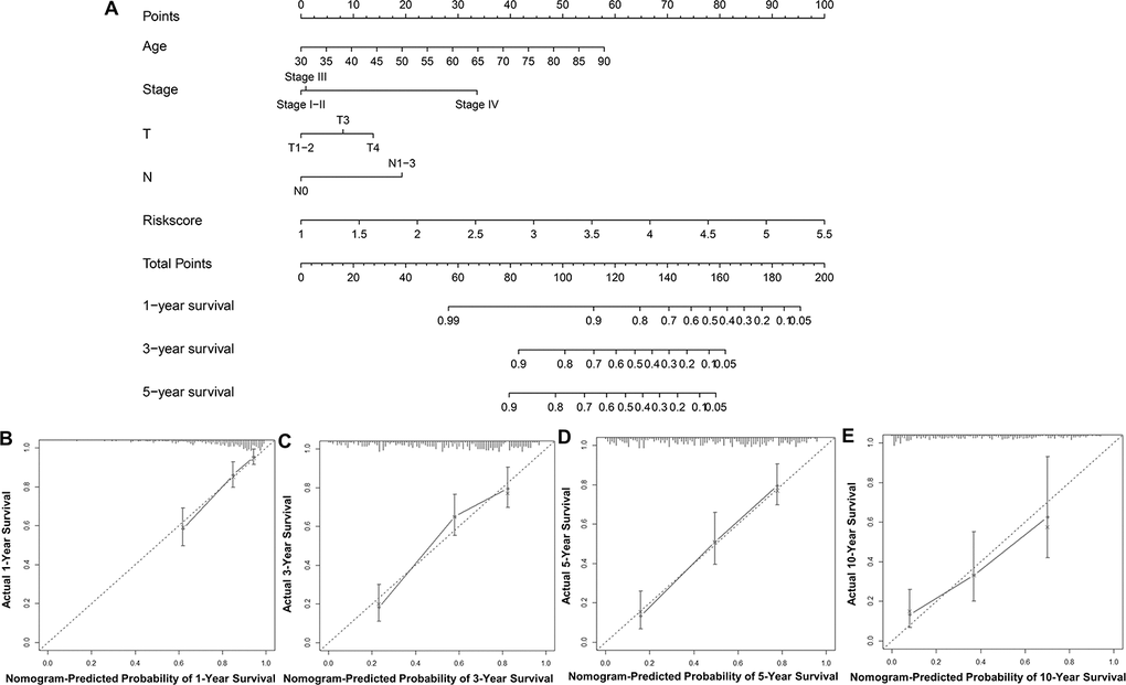 To predict UBC survival in the TCGA cohort, we constructed a nomogram by integrating risk scores of the immune-related signature and clinical information, including age, tumor stage, T stage and N stage. On the nomogram, the score on the point scale is easily obtained for each variable. Thus, survival can conveniently be estimated at 1, 3, 5 and 10 years by calculating the overall points (Figure 8A). The nomogram’s accuracy was evaluated using calibration curve analysis, which revealed consistency between the predictive curves at 1, 3, 5 and 10 years, and the ideal curve (Figure 8B–8E), indicating excellent performance by our nomogram. These data suggest that the nomogram is an effective tool for predicting UBC survival.
